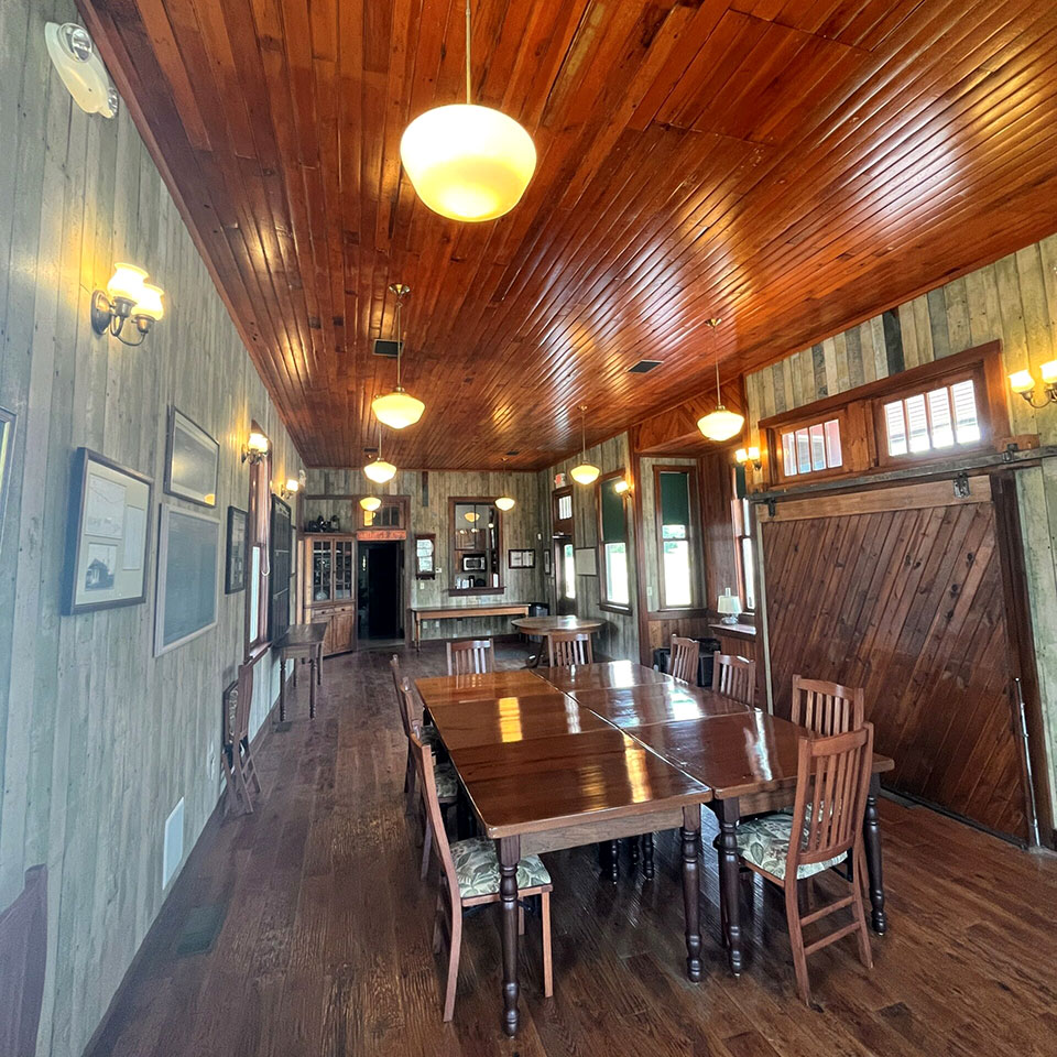 Today, it is a grand room of approximately 750 square feet, and includes two separate additions from the original depot. 1. This addition is approximately 416 square feet and includes a mechanical and tech room, a men’s and women’s restroom, and a kitchenette. 2. This addition is approximately 307sf and includes storage space, a spot for a lobby, and an access door to a handicap ramp that leads to the parking area. In total, approximately 1473 square feet.