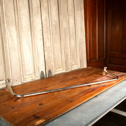 Architectural salvage chrome shower curtain / drapery rod measuring approx. 1" in diameter x 50 1/4" long x 12" front to back and brackets each measuring approx. 2" x 4 1/2". Each turned end can be adjusted or removed from the main bar. See photos to evaluate condition.