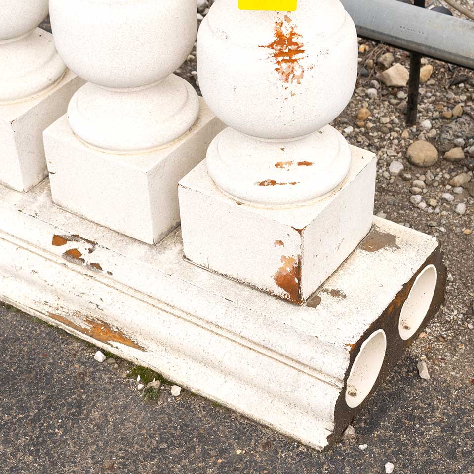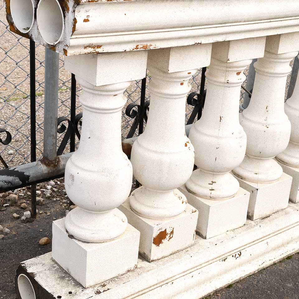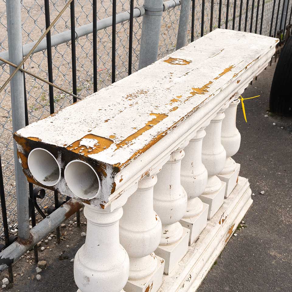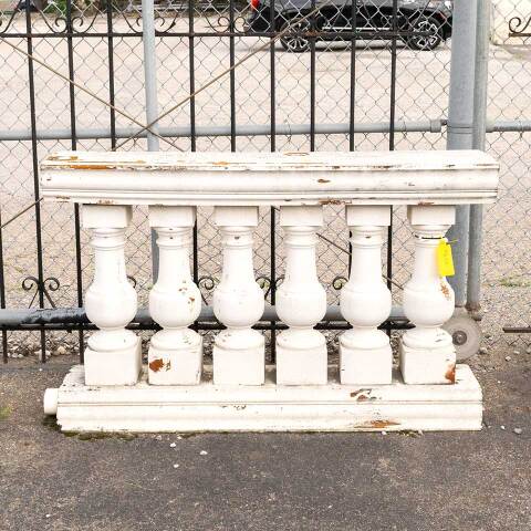 Architectural salvage exterior Fypon balustrade railing measuring approx. 57 3/8" wide x 35 1/2" tall x 12 5/8" front to back. Color and condition may vary.
