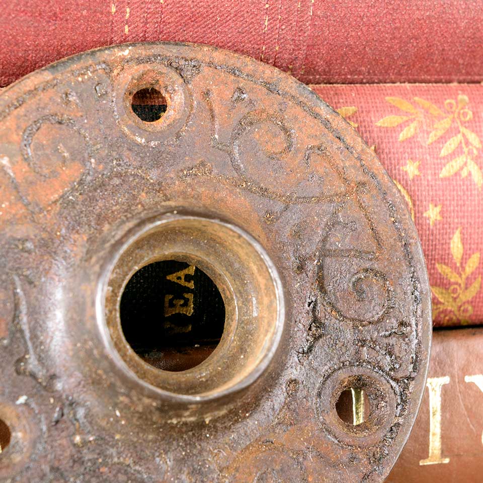Architectural salvage antique ornate cast iron doorknob rosette door hardware measuring approx. 2 1/8" in diameter with a 11/16" diameter collar. See photos to evaluate condition.
