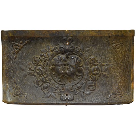 Vintage/antique architectural salvage ornate cast iron fireplace front with figural motif measuring approximately 23 3/4" wide x 13" tall x 3 1/2" front to back.
