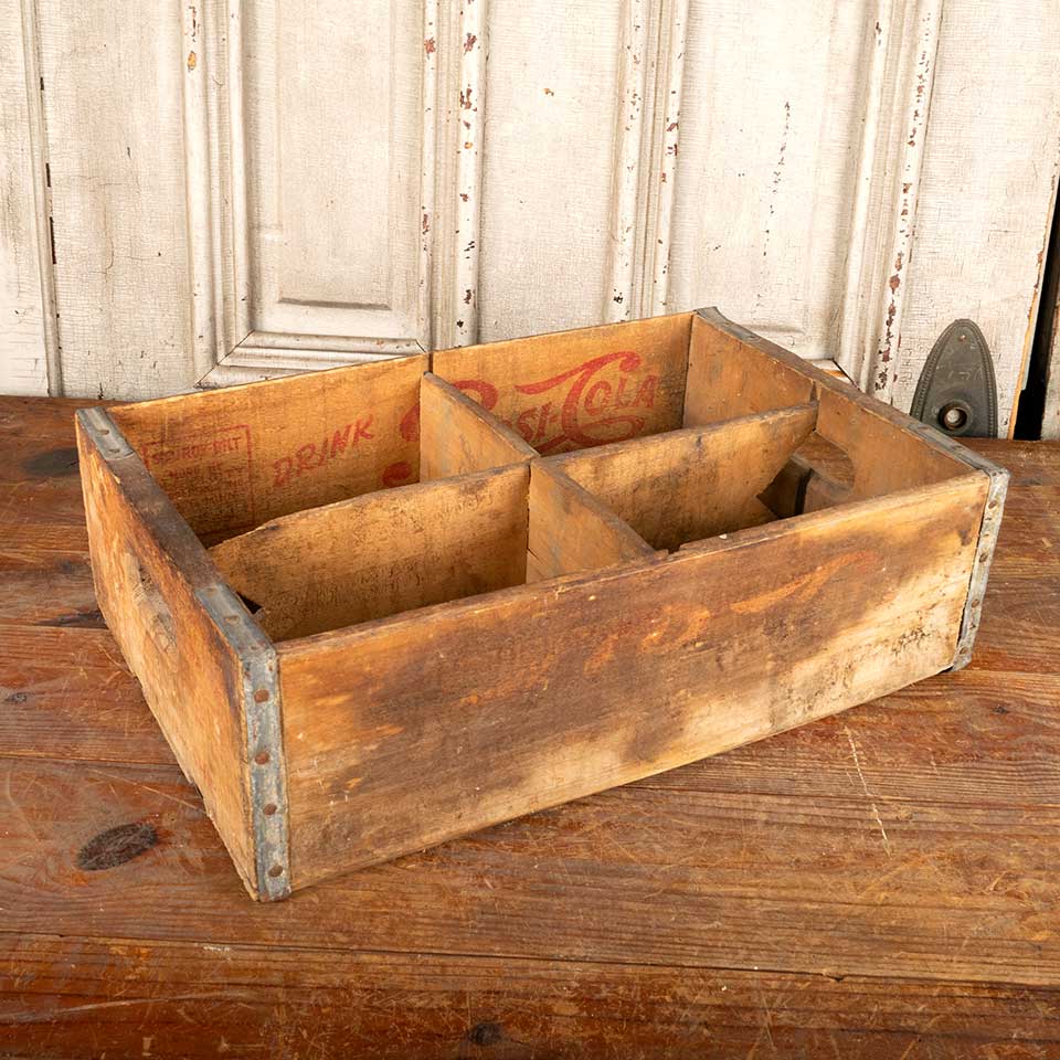 Antique PEPSI-COLA wood bottle crate with four compartments measuring approx. 12" x 18 1/2" x 5 1/2" tall. See photos to evaluate condition.