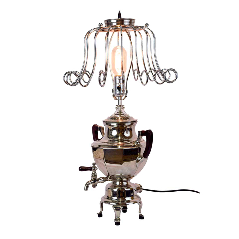 Repurposed silver plate coffee urn lamp measuring approximately 13" in diameter x 24" tall.