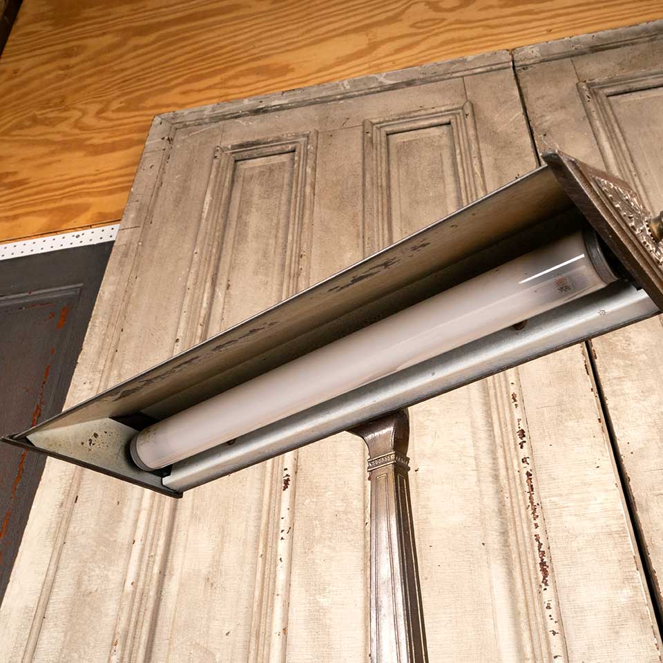 Architectural salvage antique banker's / library table / desk brass lamp measuring approx. 20 1/4" wide x 15 5/8" tall x 8 1/2" front to back. See photos to evaluate condition.