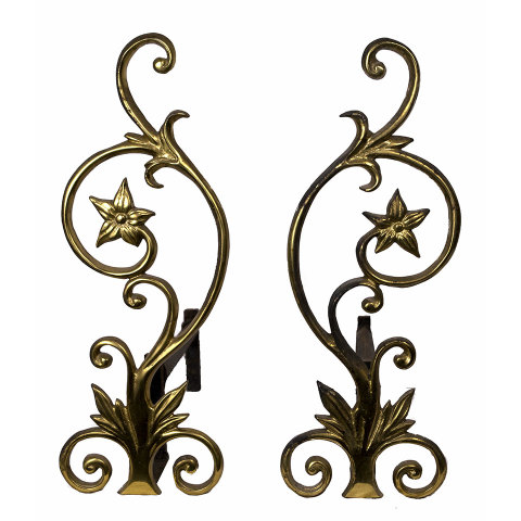 Pair of vintage brass fireplace andirons with floral motif each measuring approx. 6 7/8" wide x 18 5/8" tall x 19 1/4" front to back. See photos to evaluate condition. Priced at $75 for the pair.