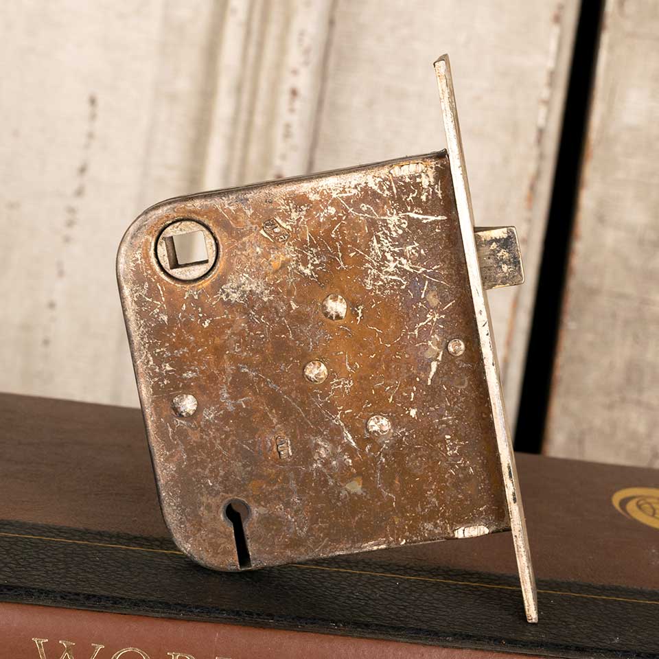 Architectural salvage antique Yale & Towne interior door mortise lock with reversible latch and skeleton key operated deadbolt. Approximate measurements as follows: