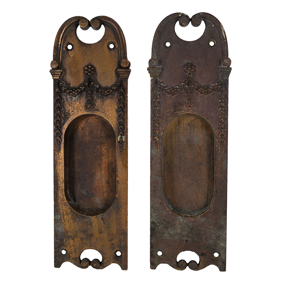 Pair of vintage/antique architectural salvage cast brass/bronze Corbin Boston pattern pocket door pulls hardware each measuring approximately 2 1/2" wide x 7 3/4" tall x 5/8" front to back. Priced at $250 for the pair.