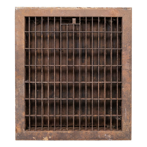 Vintage antique architectural salvage pressed metal heat grate with operable louvers measuring approximately 12" x 14" (insert dimensions) and 13 7/8" x 15 3/4" (overall dimensions).