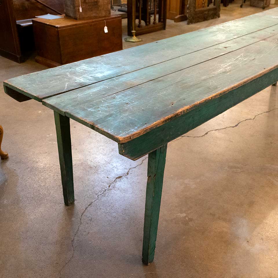 Antique primitive painting wood harvest table with folding legs measuring approx. 29" wide x 30 1/2" tall x " 119 3/4" long. See photos to evaluate condition.