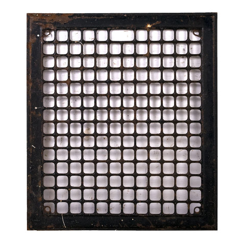 Vintage antique architectural salvage pressed metal heat grate measuring approximately 12" x 14" (insert dimensions) and 14 1/16" x 16 1/8" (overall dimensions). This grate does not have louvers and has some damage to louver mounts (See photos).