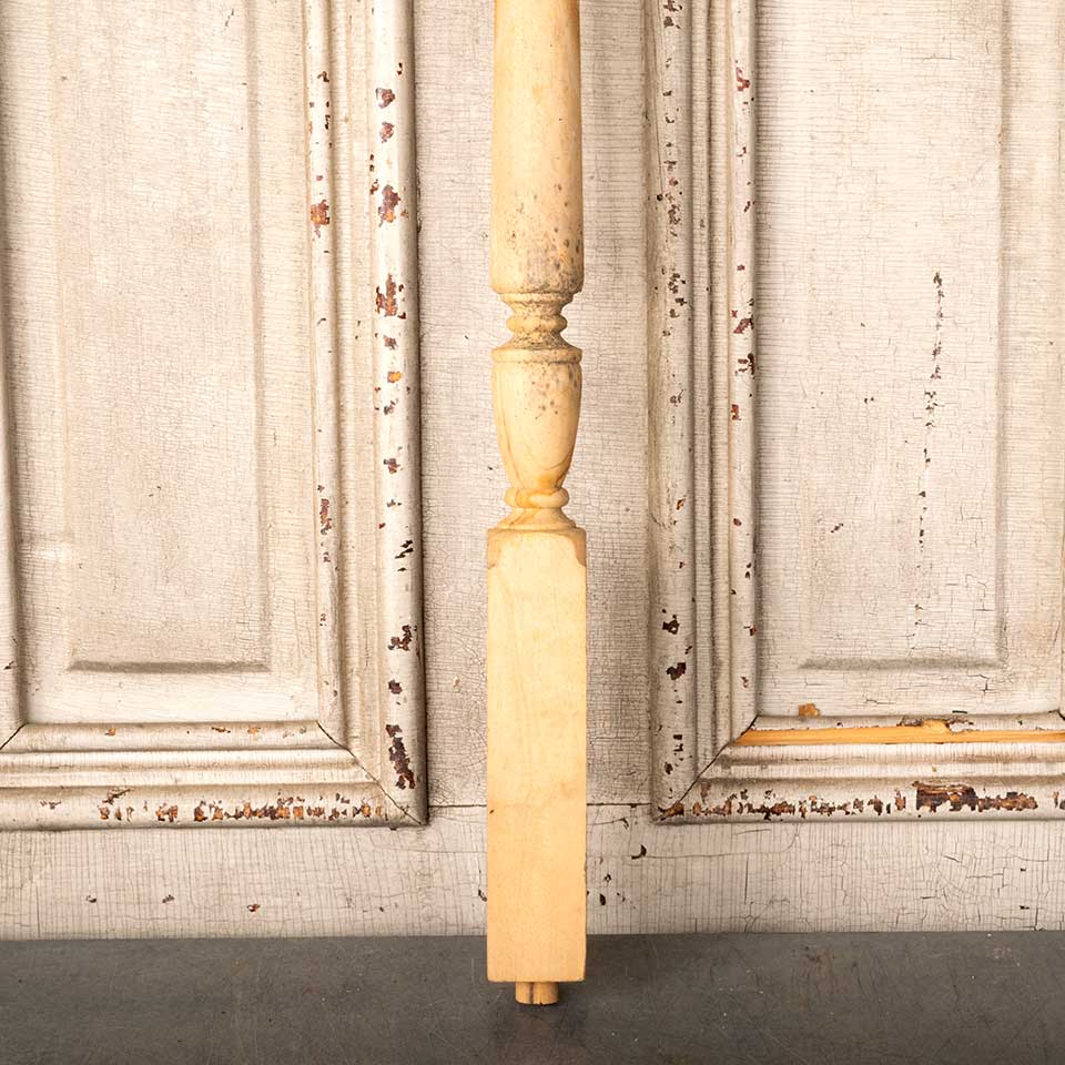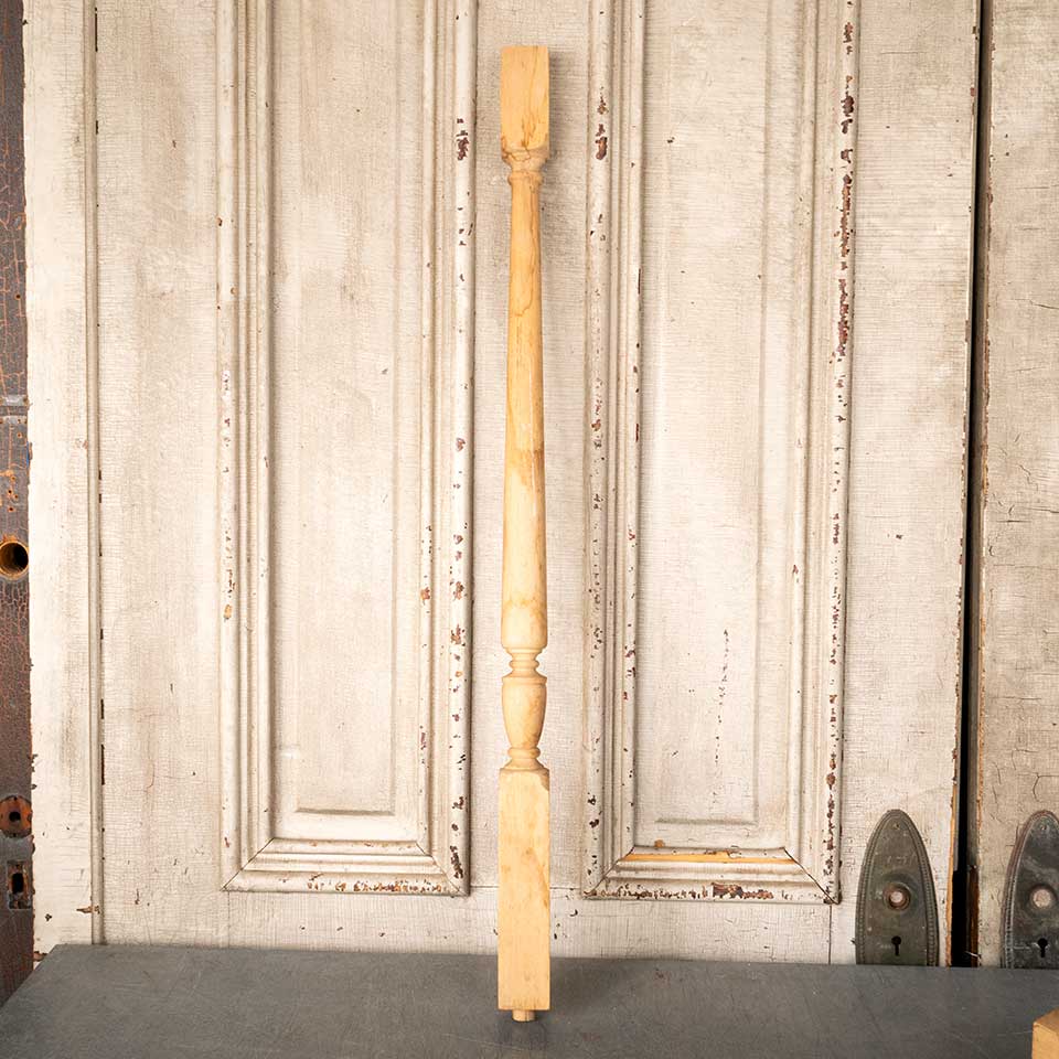 Architectural salvage turned poplar wood staircase baluster spindle measuring approx. 1 3/4" x 1 3/4" x 33 7/8" tall. Color and condition may vary. Priced at $10/each.