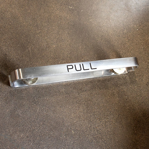 Pair of architectural salvage chrome PUSH and PULL entry door bar handles each measuring approximately 20 7/16" wide x 1 7/16" tall with a 2" projection. Each mounting rosette measures 2 3/8" in diameter. Priced at $225 for the pair.