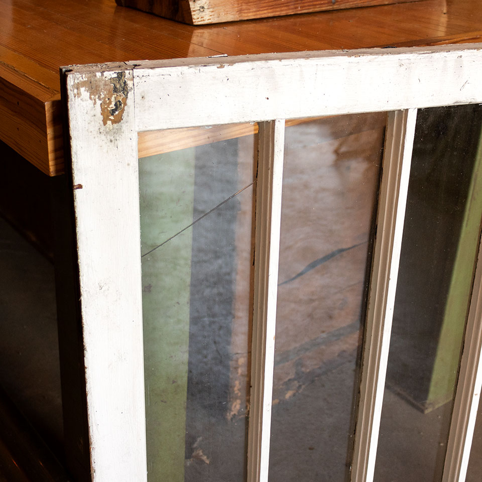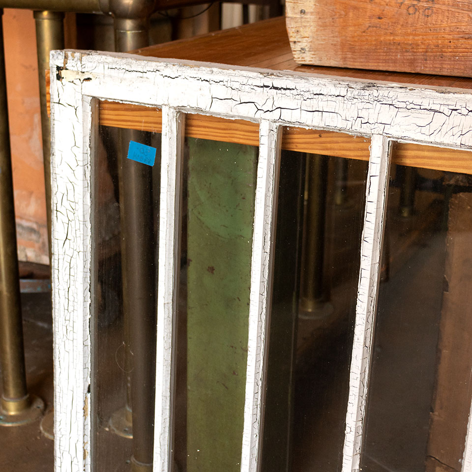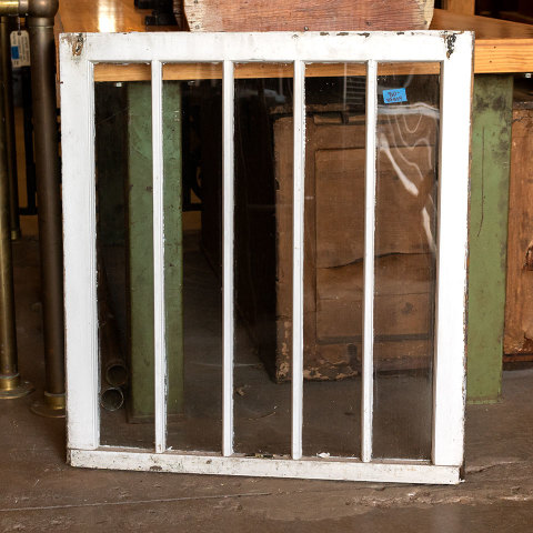 Vintage antique architectural salvage divided lite wood window sash measuring approximately 30 1/2" wide x 33 1/2" tall x 1 1/2" thick. Priced at $80/each. Due to the nature of architectural salvage - condition and color may vary.