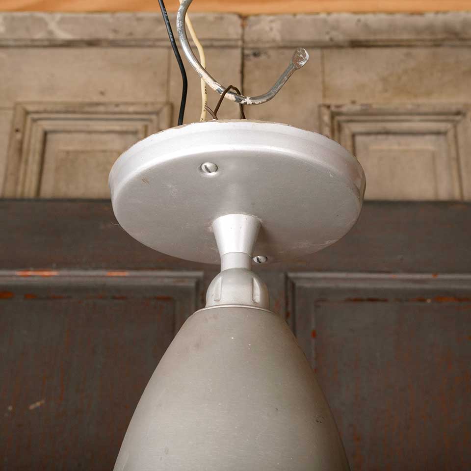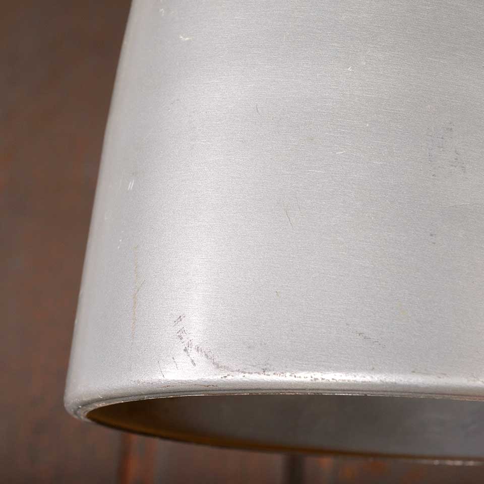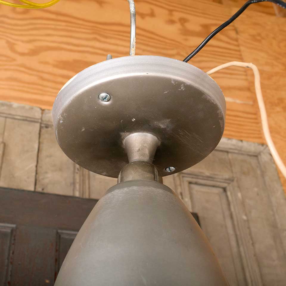 Architectural salvage vintage single bulb metal adjustable pendant light fixture measuring approx. 6" in diameter x 12 1/4" tall. Color and condition may vary. Salvaged lighting should be inspected by a licensed electrician prior to installation.