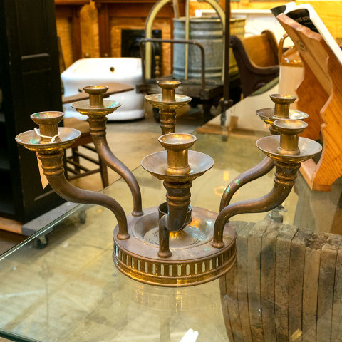 Seven candle round brass candelabra measuring approximately 19" in diameter x 10 1/2" tall with a 12 1/2" with an 8 1/2" diameter base.