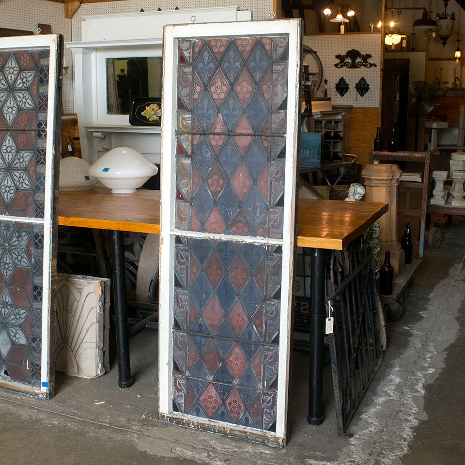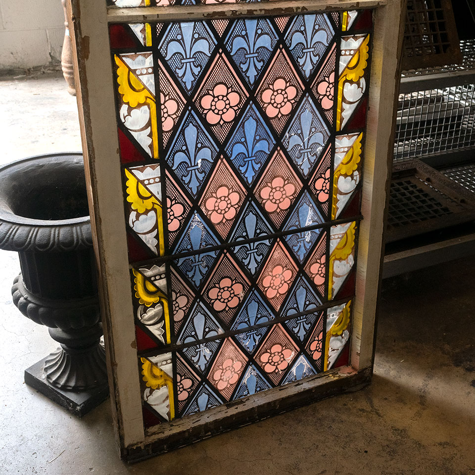 Antique architectural salvage stained glass panel with hand painted design and wood window frame measuring approximately 23 3/4" wide x 67 3/4" tall x 1 5/8" thick. There are two cracked panes of glass. Please see photos to evaluate condition.
