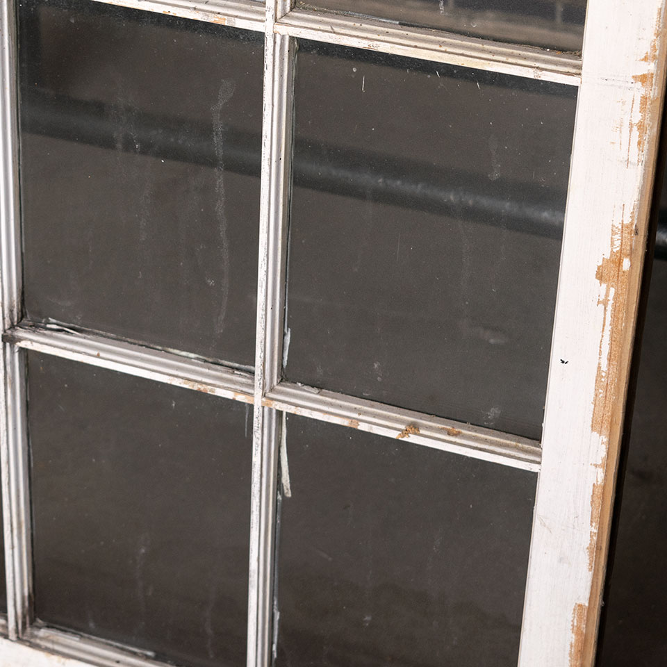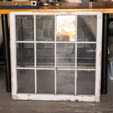 Vintage antique architectural salvage six lite wood window sash with wavy glass measuring approximately 33 7/8" wide x 33 1/2" tall x 1 3/8" thick.