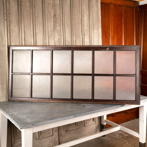 Antique architectural salvage divided lite interior pine wood entry door transom window with 12 privacy glass panes measuring approximately 63 1/8" long x 27 1/2" tall x 1 3/4" thick. This window was reclaimed from Grandview Heights (Ohio) High School prior to the building's renovation.