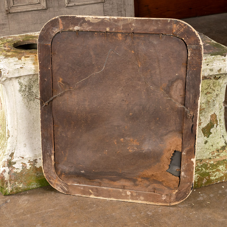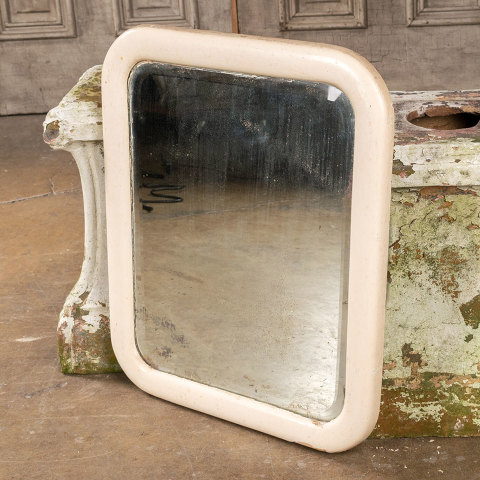 Antique wall hanging wood frame with rounded corners and beveled glass mirror measuring approximately 19 1/2" wide x 23 1/2" tall x 1" thick.