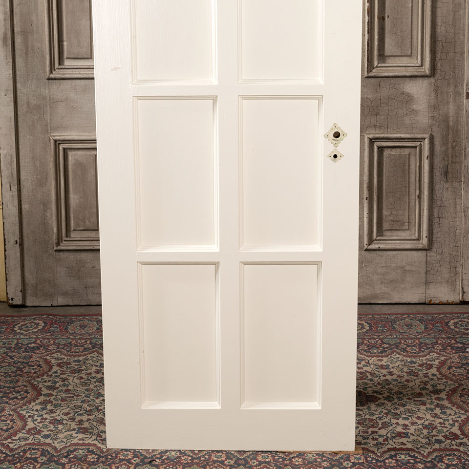 Vintage architectural salvage eight panel painted wood interior door measuring approximately 27 7/8" wide x 79 1/4" tall x 1 3/4" thick.