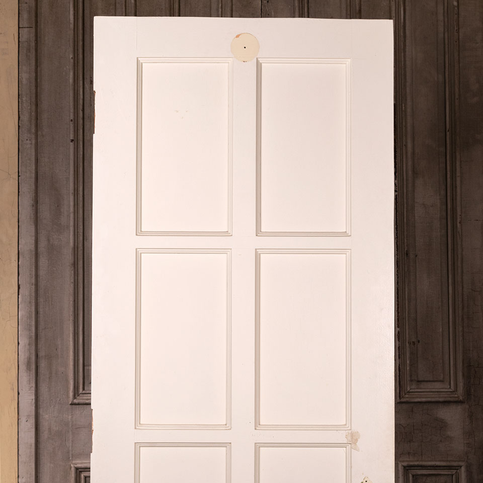 Vintage antique architectural salvage eight panel interior painted wood door measuring approximately 27 15/16" wide x 78 1/2" tall x 1 3/4" thick.