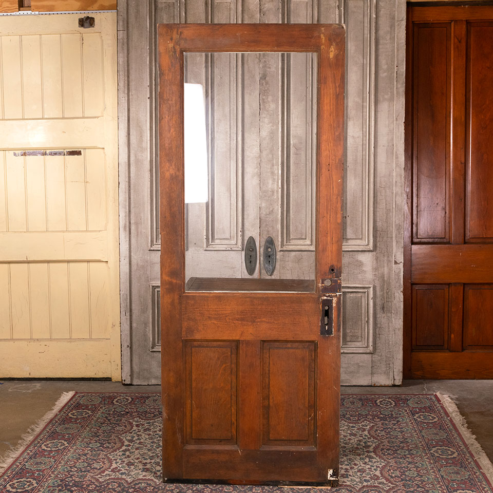Antique architectural salvage solid wood paneled entry door with half lite glass window measuring approximately 31 1/2" wide x 80 1/4" tall x 1 3/4" thick.