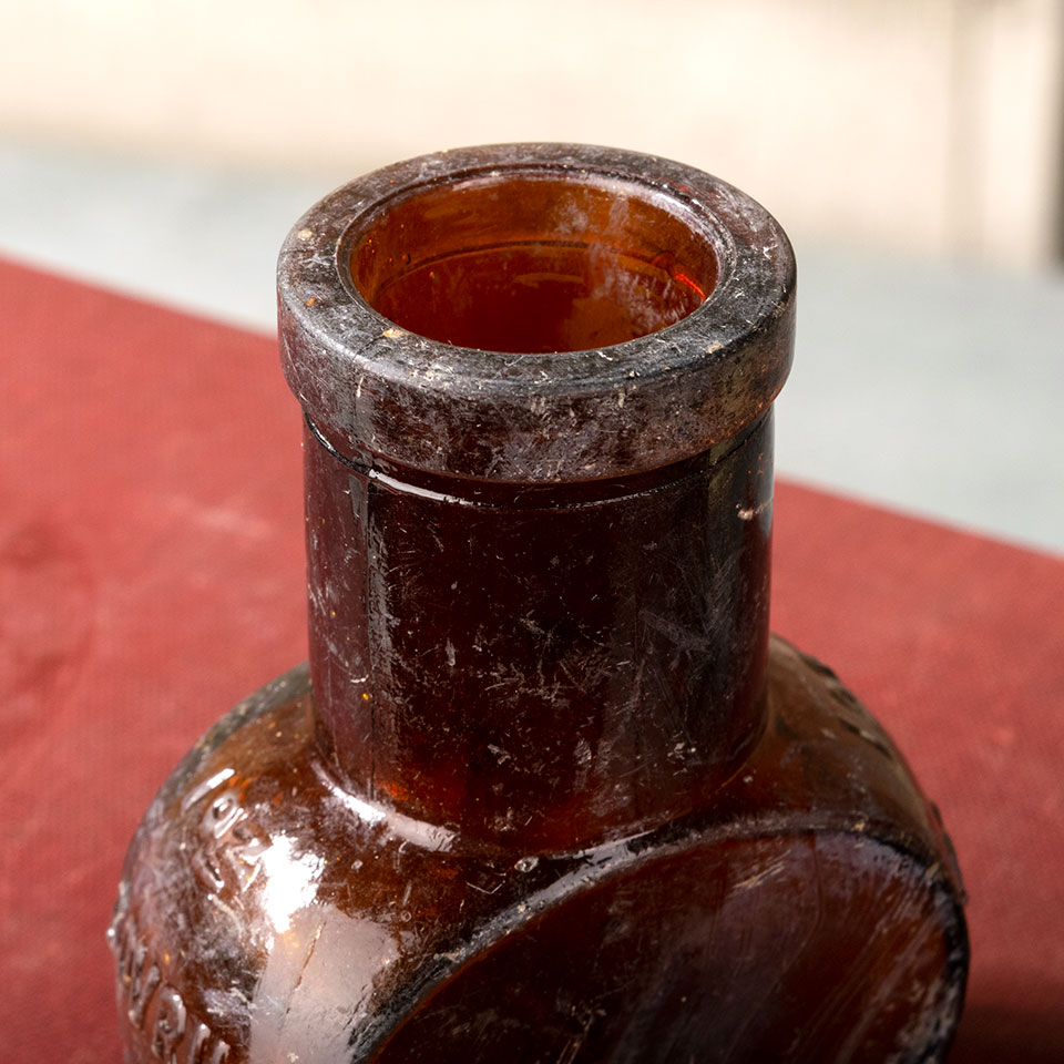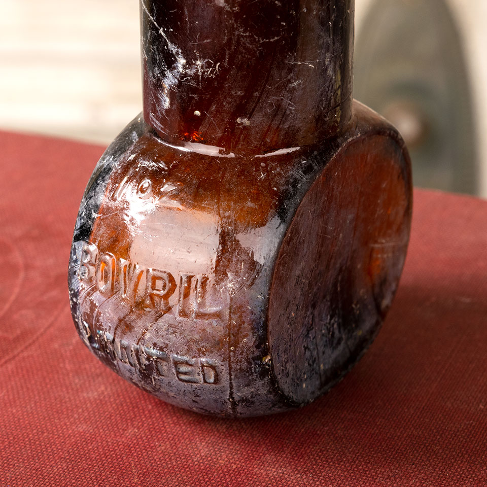 Small antique amber glass Bovril Limited bottle measuring approximately 2" x 2 11/16" x 1 1/8" with a 3/4" diameter mouth opening.