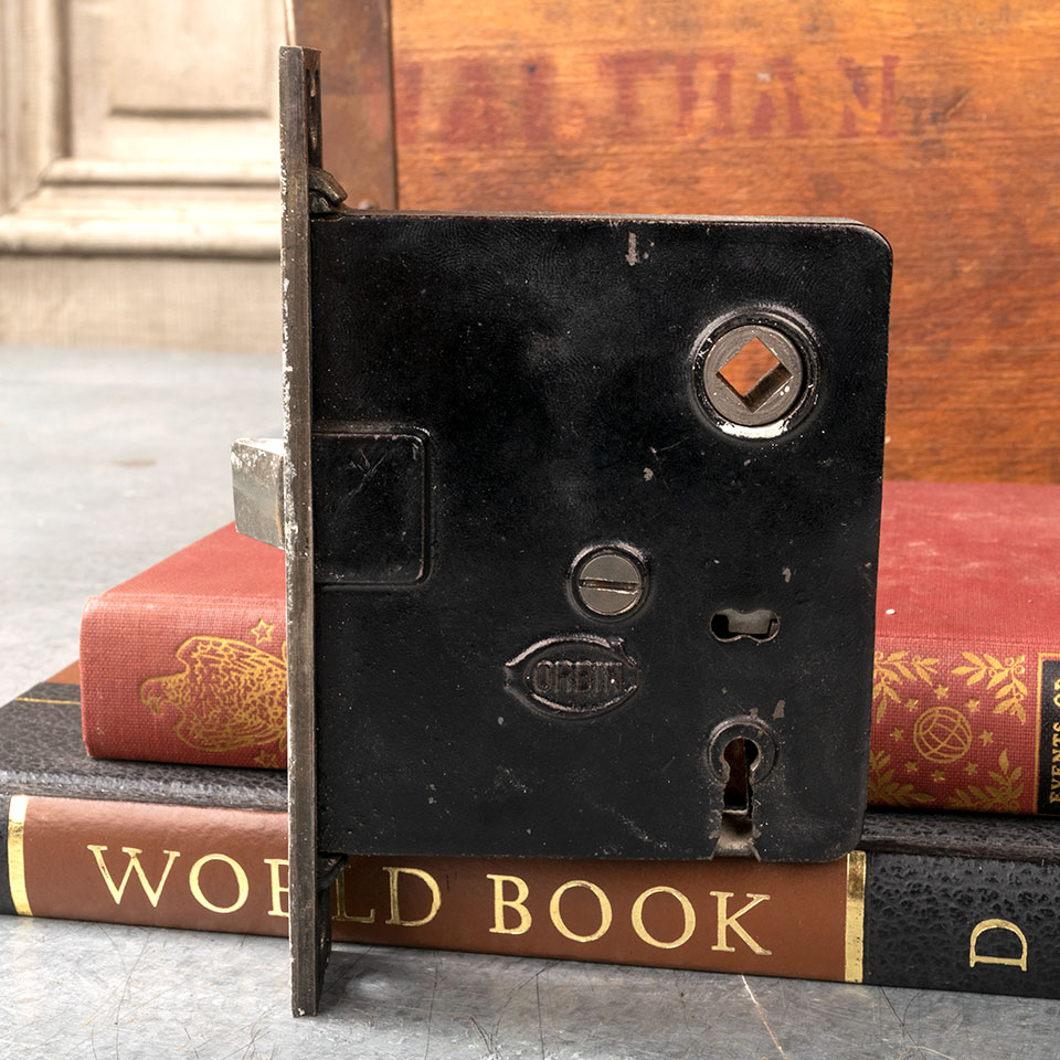 Antique architectural salvage brass & cast iron Corbin reversible interior door mortise latch with skeleton keyhole deadbolt measuring approx. 15/16" x 5 3/8" x 1/8" face and 1/2" x 3 5/8" x 3 1/4 body with a 2 1/2" backset. The spindle and keyholes measure 2 1/2" on centers. Key and strike NOT included. Color and condition vary, see photos to evaluate. Priced at $20 each.