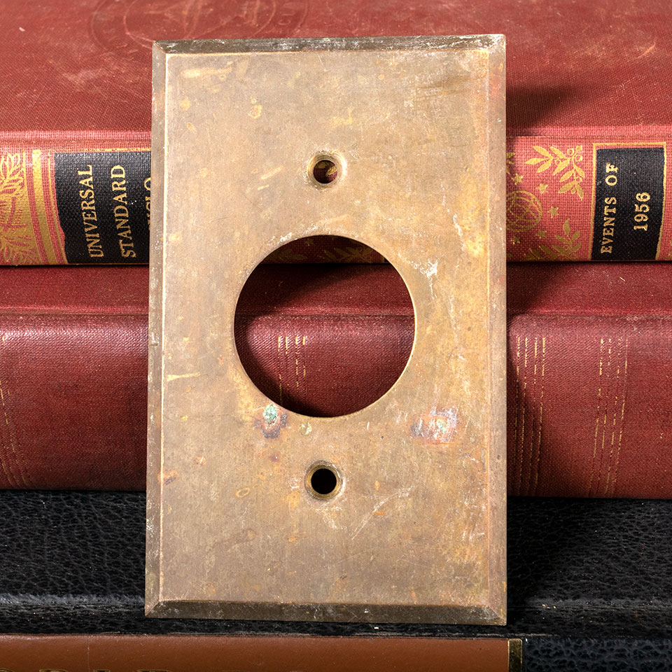 Architectural salvage antique brass single gang receptacle electrical outlet cover plate measuring 2 5/16" x 4 1/2" overall with 1 3/8" diameter opening. Color and condition vary, see photos to evaluate. Priced at $15/ each.