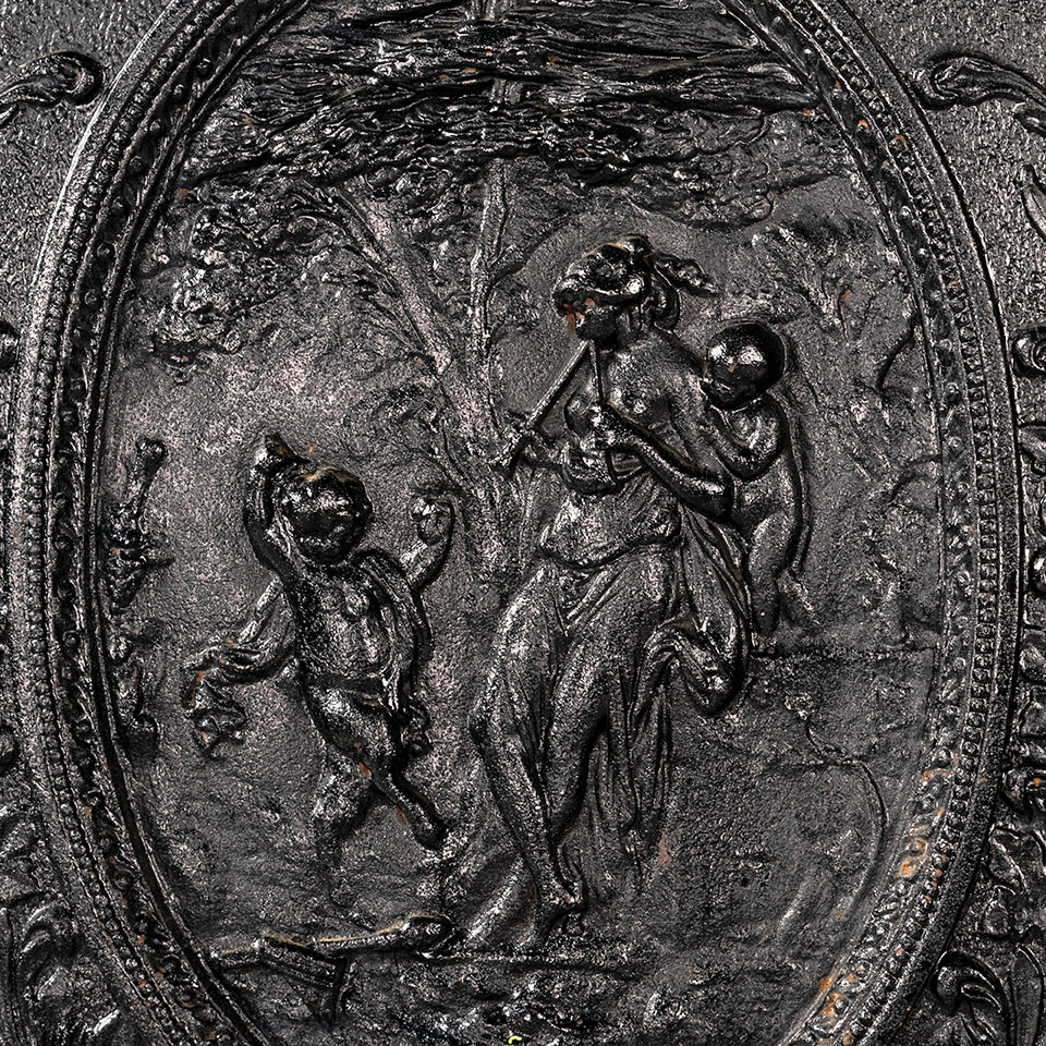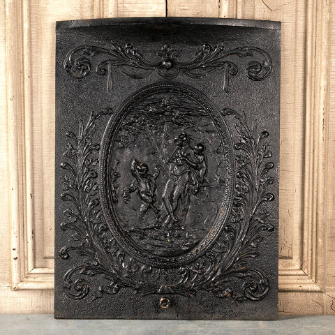 Architectural salvage antique high relief cast iron fireplace summer front cover with figural motif measuring approx. 20" wide x 26 1/2" tall x 1 3/4" front to back. See photos to evaluate condition.