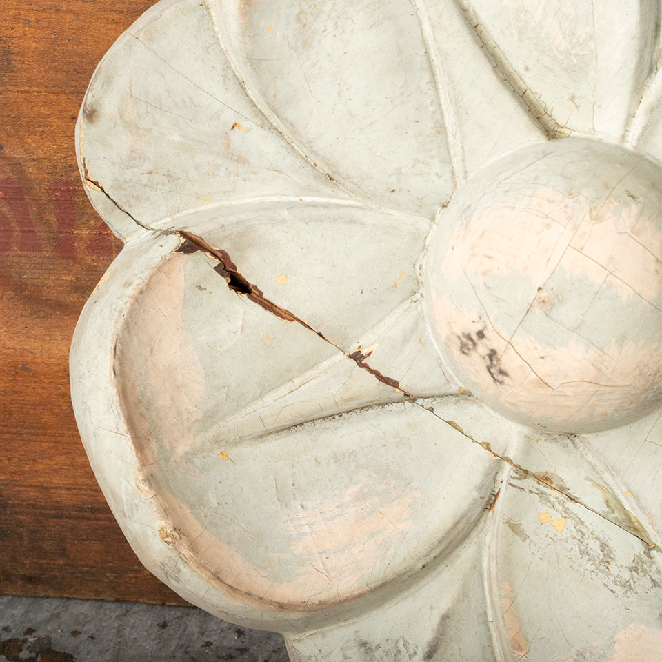 Large interior antique architectural salvage carved solid wood floral flower rosette medallion. Sold individually. Priced at $150/each. Condition varies. Quantity 2 of the lot have repaired damage. First come, first serve. Sold AS IS. See photos to evaluate condition. Measurements: 10 3/8" diameter x 2" wide