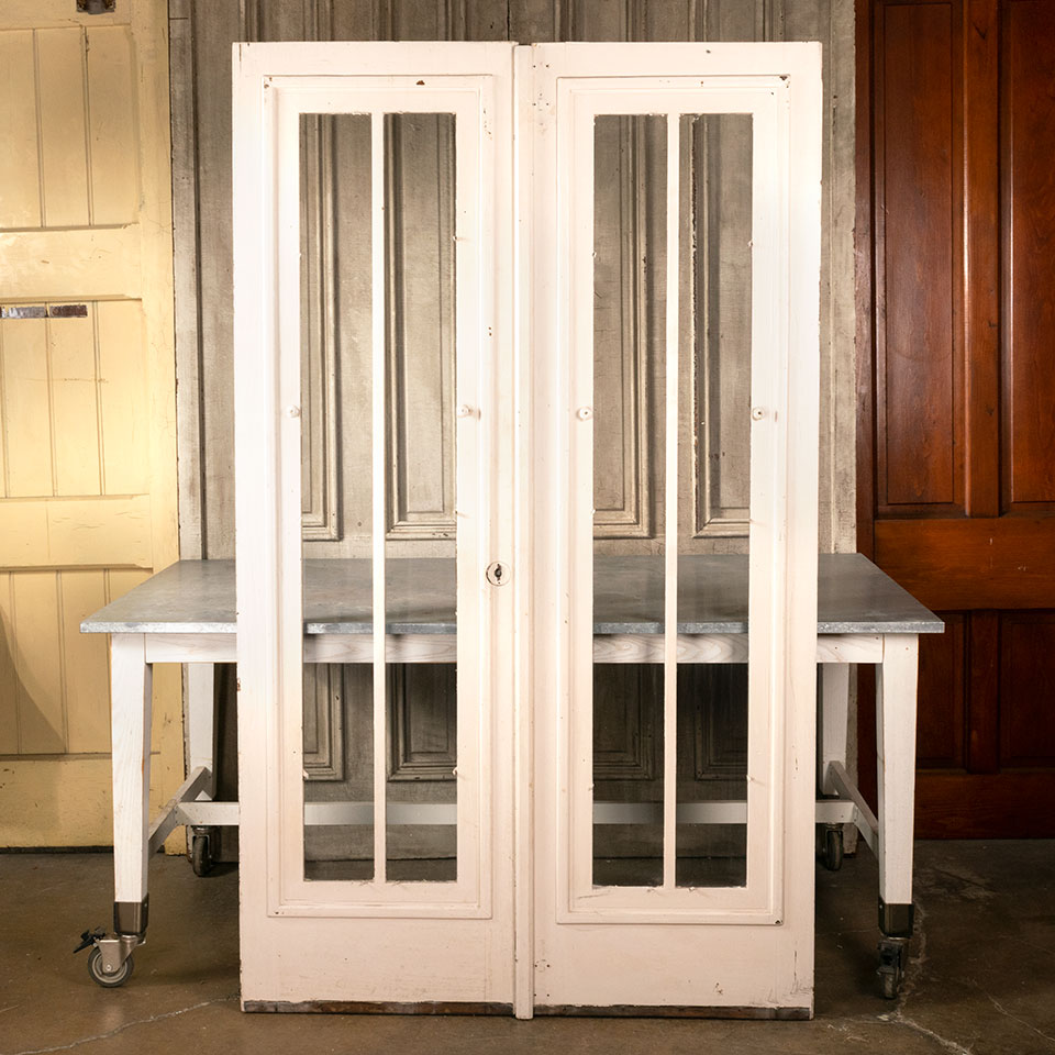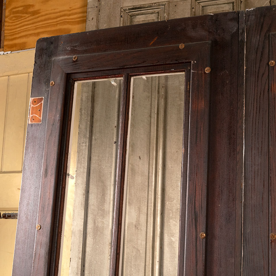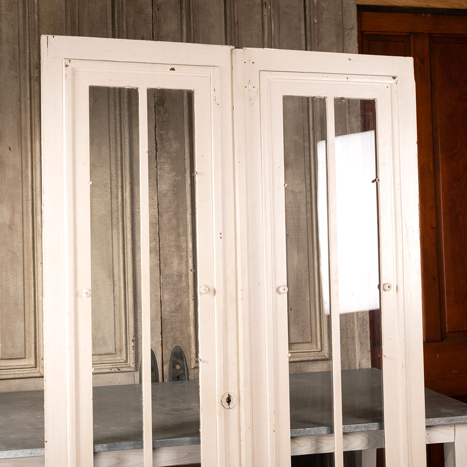 Pair of exterior antique architectural salvage redwood full lite storm doors with removable horizontal divided glass storm window panels with astragal together measuring approximately 47 7/8" wide x 80 1/4" tall x 1 1/8" thick. Priced at $400 for the pair.