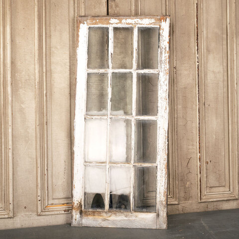 Architectural salvage antique divided 12 lite wood window sash with wavy glass measuring approximately 18 3/8" wide x 40 7/8" tall x 1 5/16" thick. There are 2 cracked panes of glass. See photos to evaluate condition.