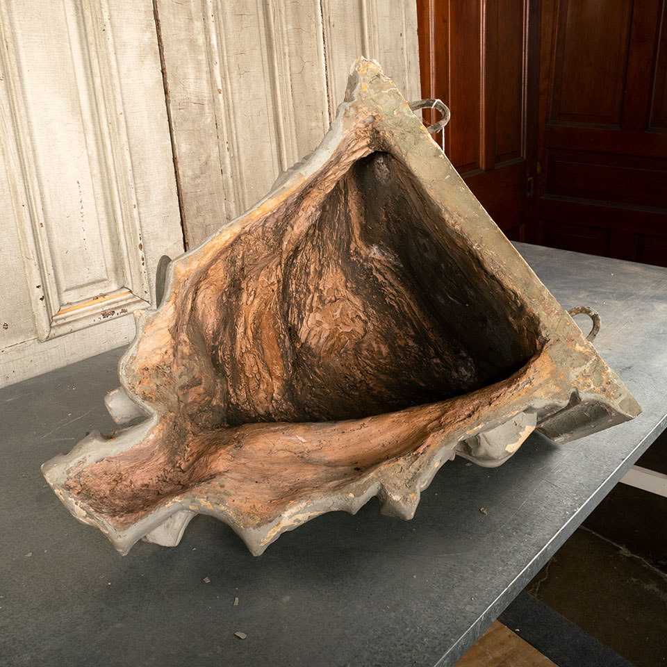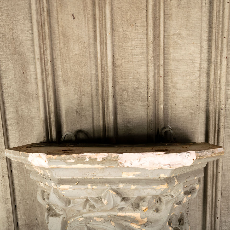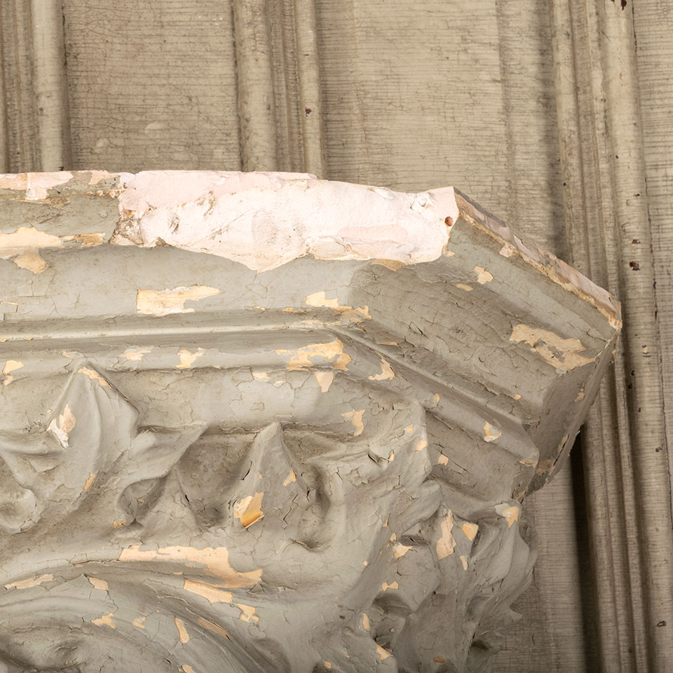 Antique architectural salvage cast plaster architectural ornament measuring approx. 22 1/4" wide x 24" tall x 16 1/2" front to back. There is some plaster loss along the front edge of the piece. See photos to evaluate condition.