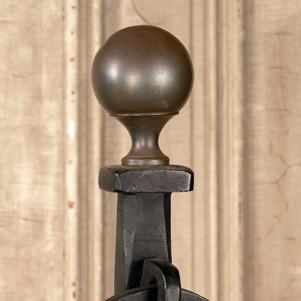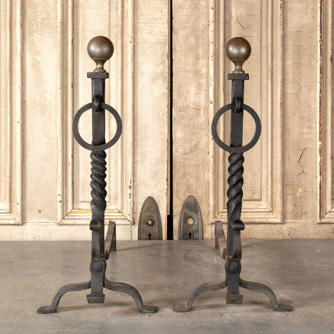 Antique architectural salvage wrought iron fireplace andirons each measuring approx. 11 1/4" wide x 25 3/4" tall x 24 1/2" front to back. See photos to evaluate condition. Priced at $425 for the pair.