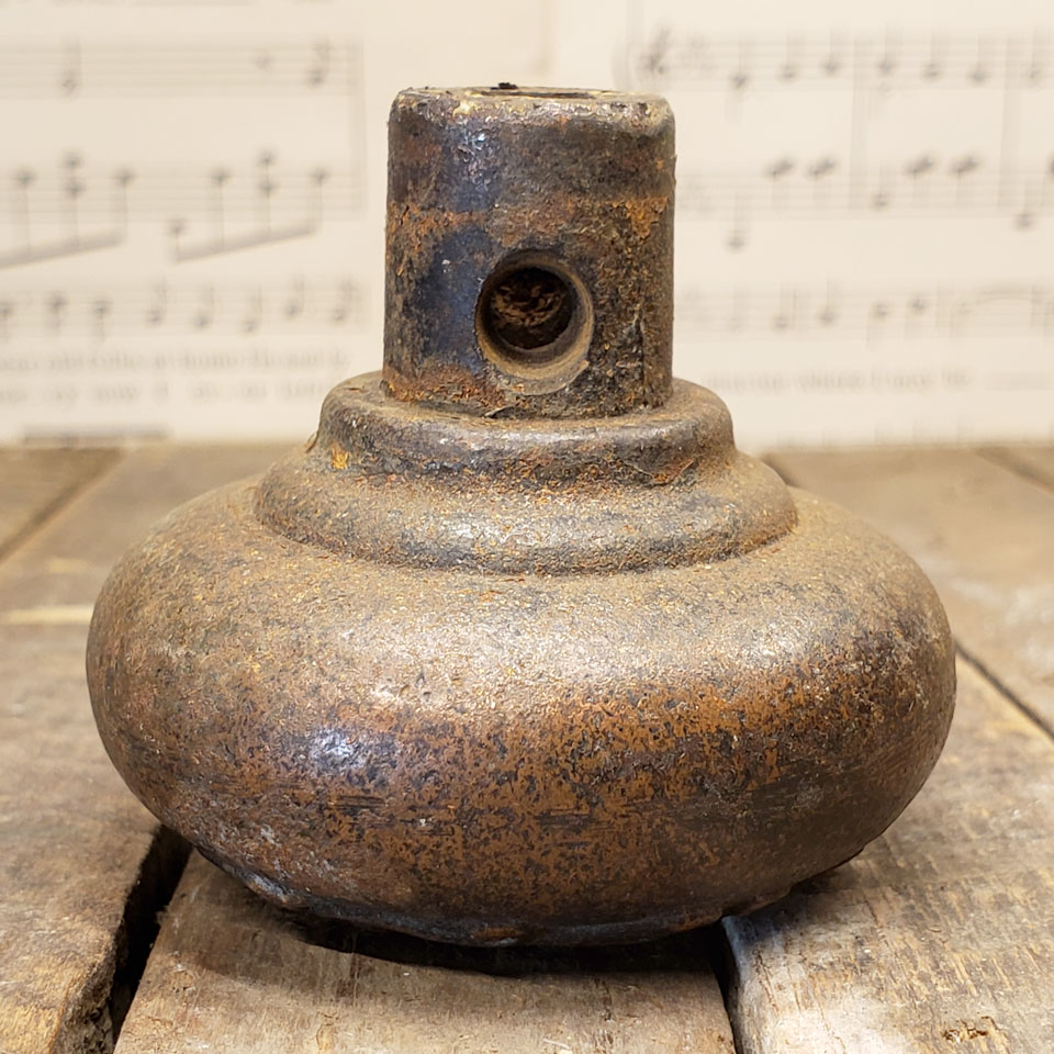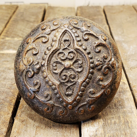 Antique architectural salvage cast iron Corbin twofold symmetry pattern single doorknob circa 1898 measuring approximately 2 1/4" in diameter with a 3/4" diameter neck/stem. Fits a 1/4" square spindle.