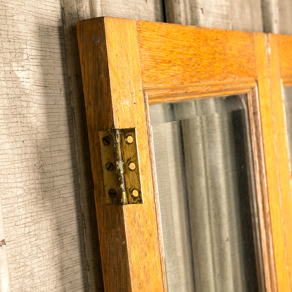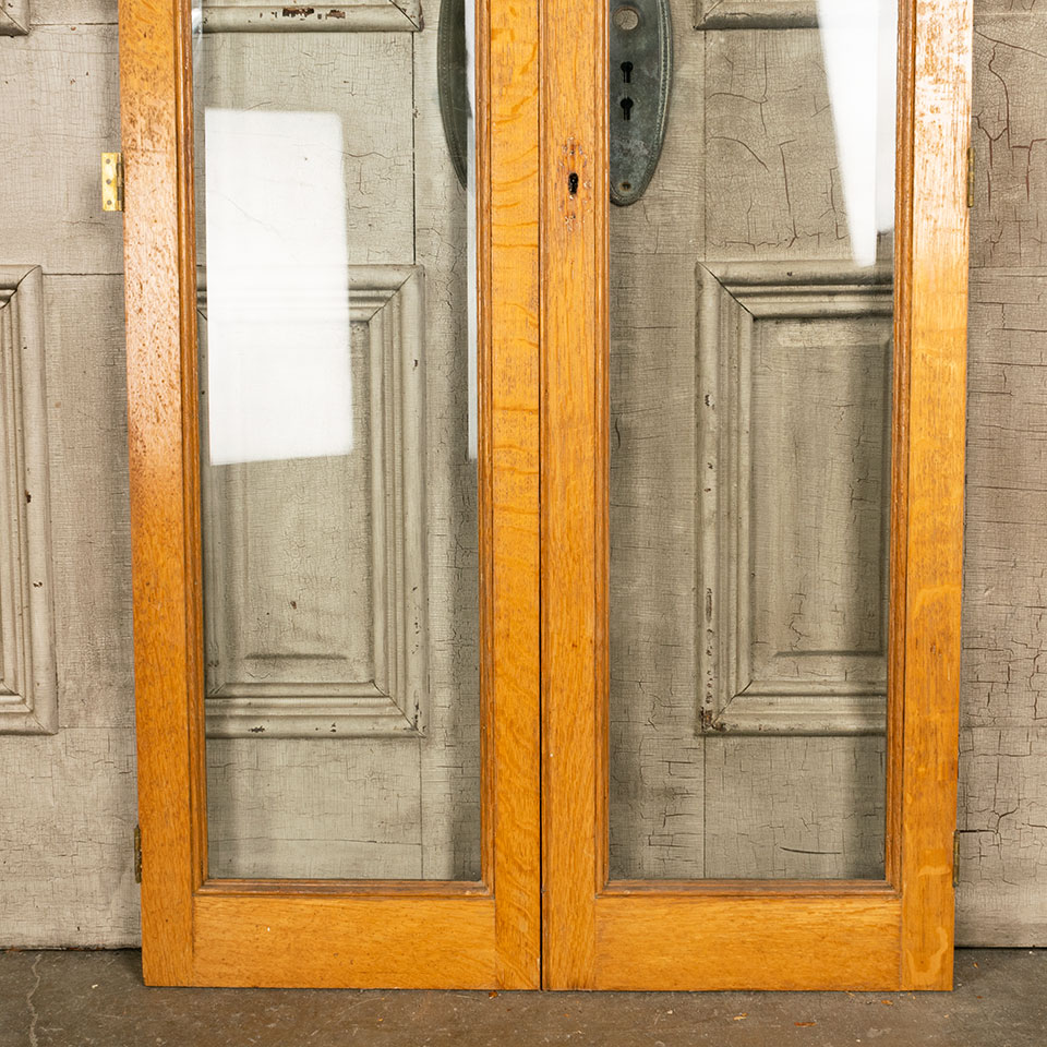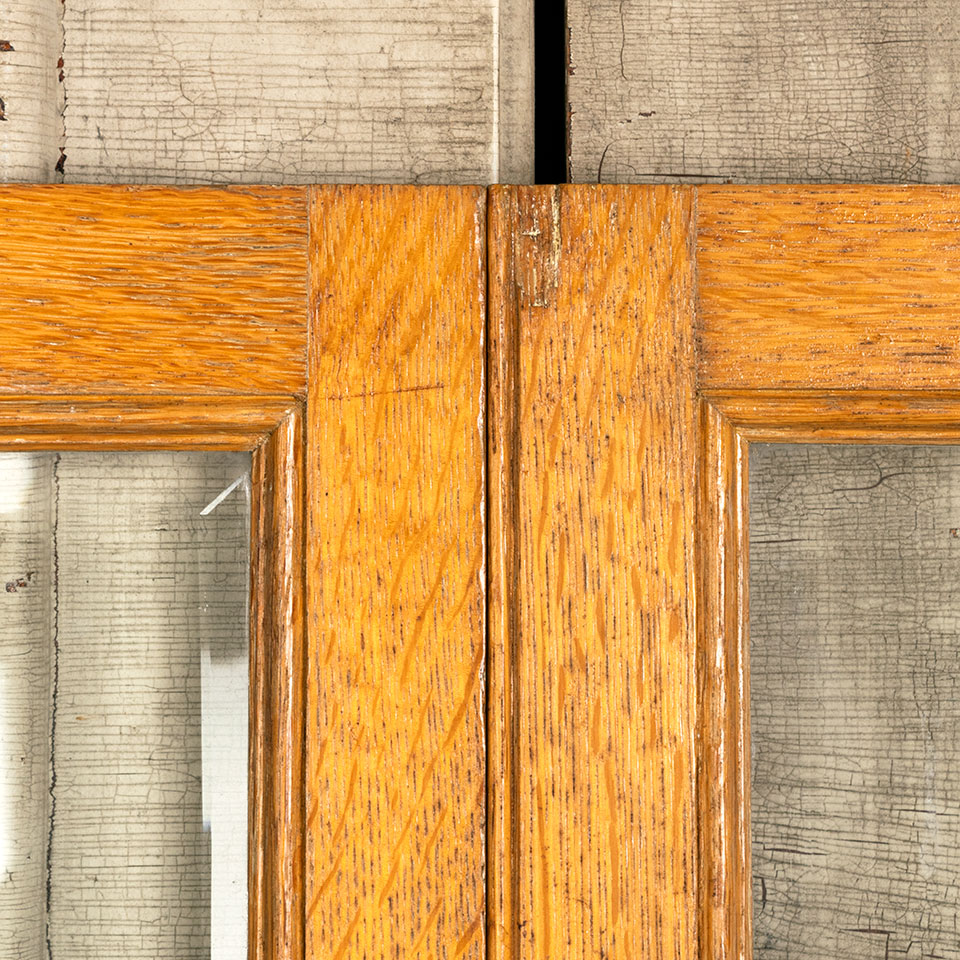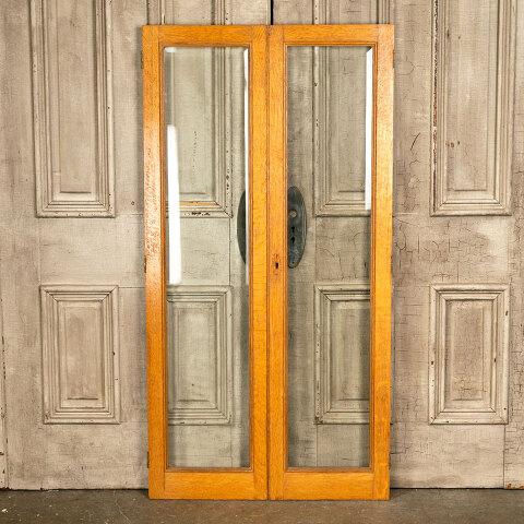 Pair of antique architectural salvage oak cabinet doors with beveled glass together measuring approx. 29 3/4" wide x 57 5/8" tall x 7/8" thick. There's some wood loss at the top left corner of the right door. See photos to evaluate condition. Priced at $295 for the pair.
