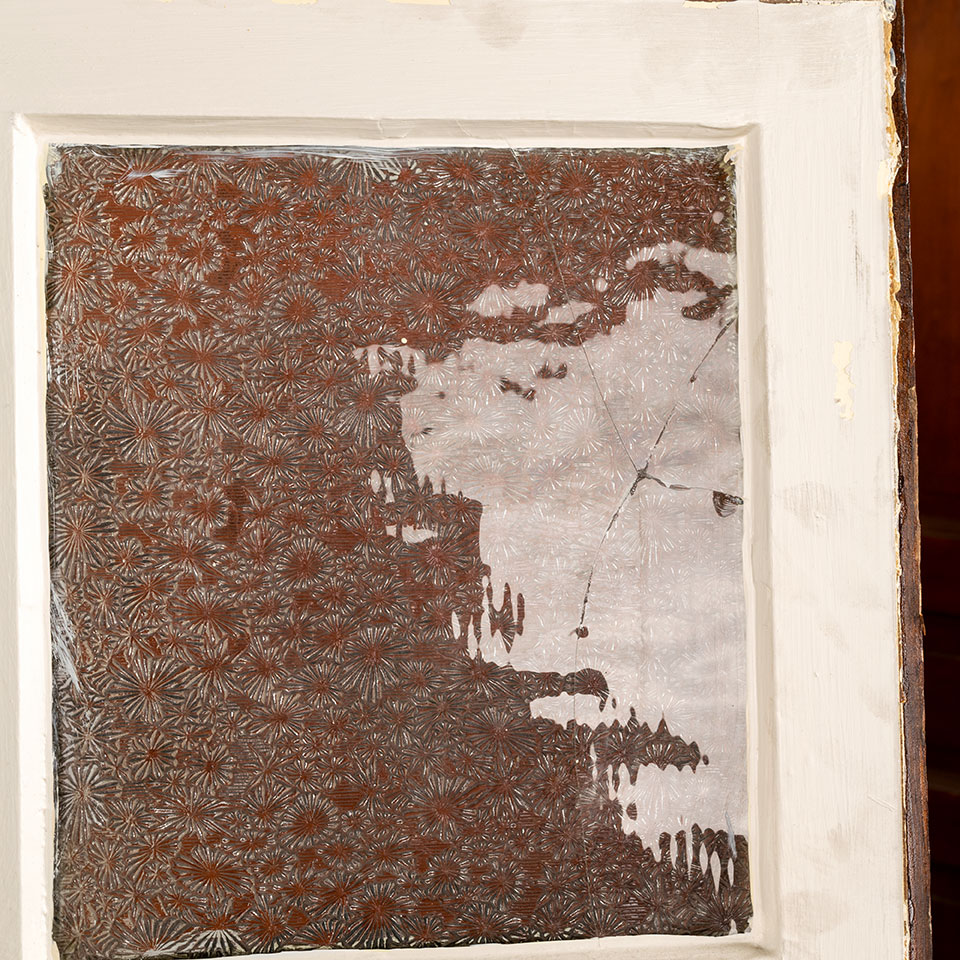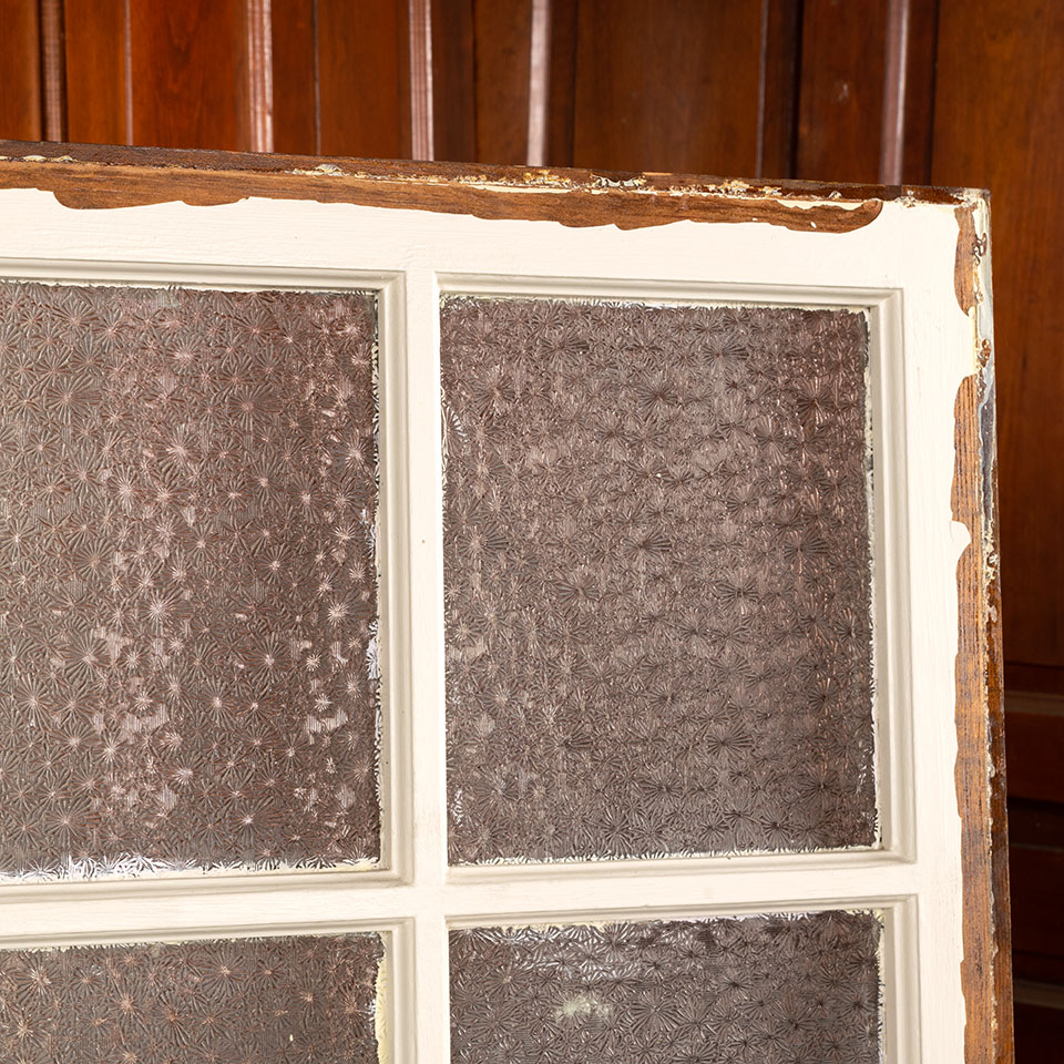 Antique architectural salvage divided 8 lite wood window sash with pressed privacy glass panes measuring approx. 43" wide x 27" tall x 1 3/8" thick. One of the panes of glass is cracked. See photos to evaluate condition.