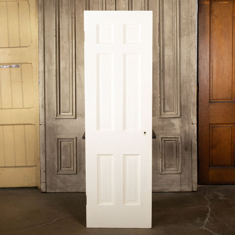 Antique architectural salvage painted wood 6 panel interior door measuring approx. 23 11/16" wide x 77 5/16" tall x 1 3/8" thick. See photos to evaluate condition.