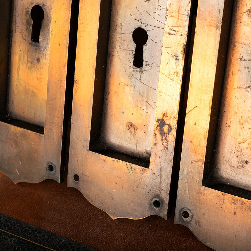 Antique architectural salvage pocket door hardware pulls and locks set. The set includes 4 cast bronze pulls with a japanned finish (approx. 2 3/4" wide x 8" tall with a 1 3/4" wide x 4 1/2" tall recessed area), 2 mortise locks with pop-out finger pulls (faceplates: 1 1/4" wide x 7 5/8" tall; mortise bodies: 5/8" wide x 5 1/4" tall one with a 3 3/4" overall back set and the other with a 3 3/8" overall backset). See photos to evaluate condition. Sold as set. Priced at $450 for the 6 piece set.