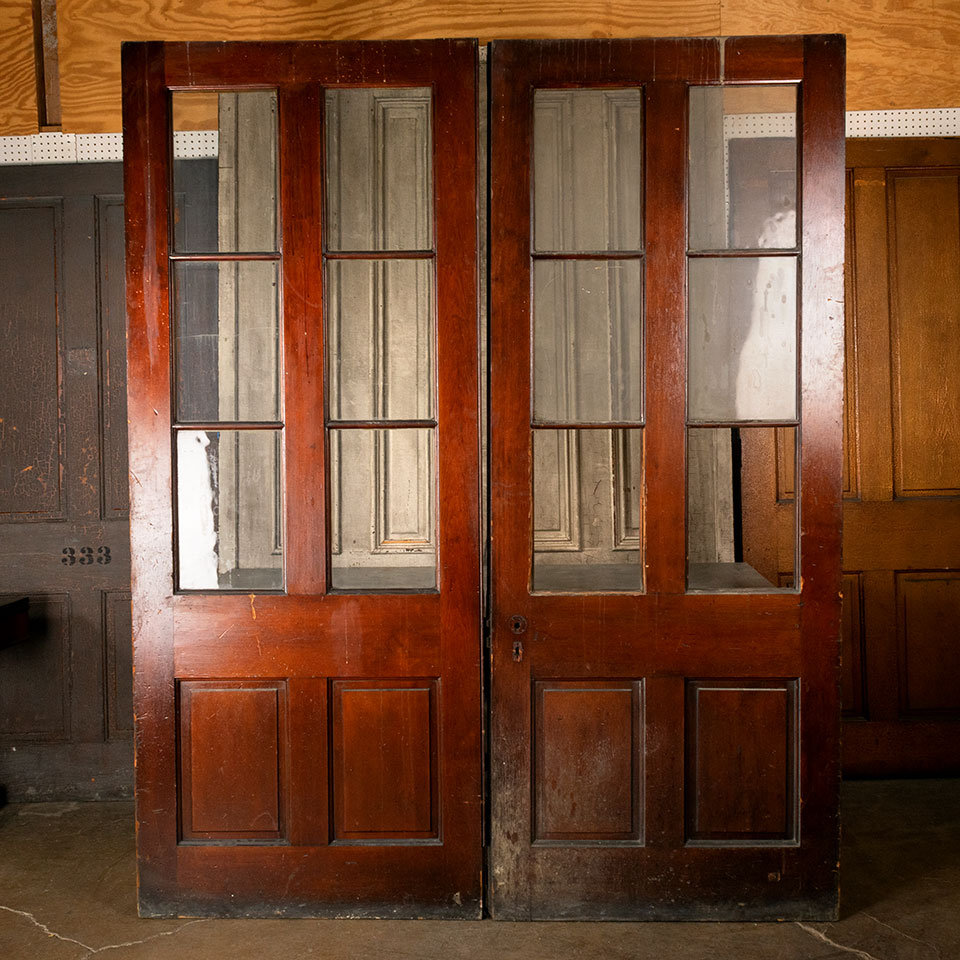 Pair of oversized antique architectural salvage paneled wood interior doors with divided lite glass windows together measuring approx. 76 3/4" wide x 95 5/8" tall x 1 3/4" thick. One of the doors has missing, cracked, and replaced glass panes. See photos to evaluate condition. Priced at $4,500 for the pair.