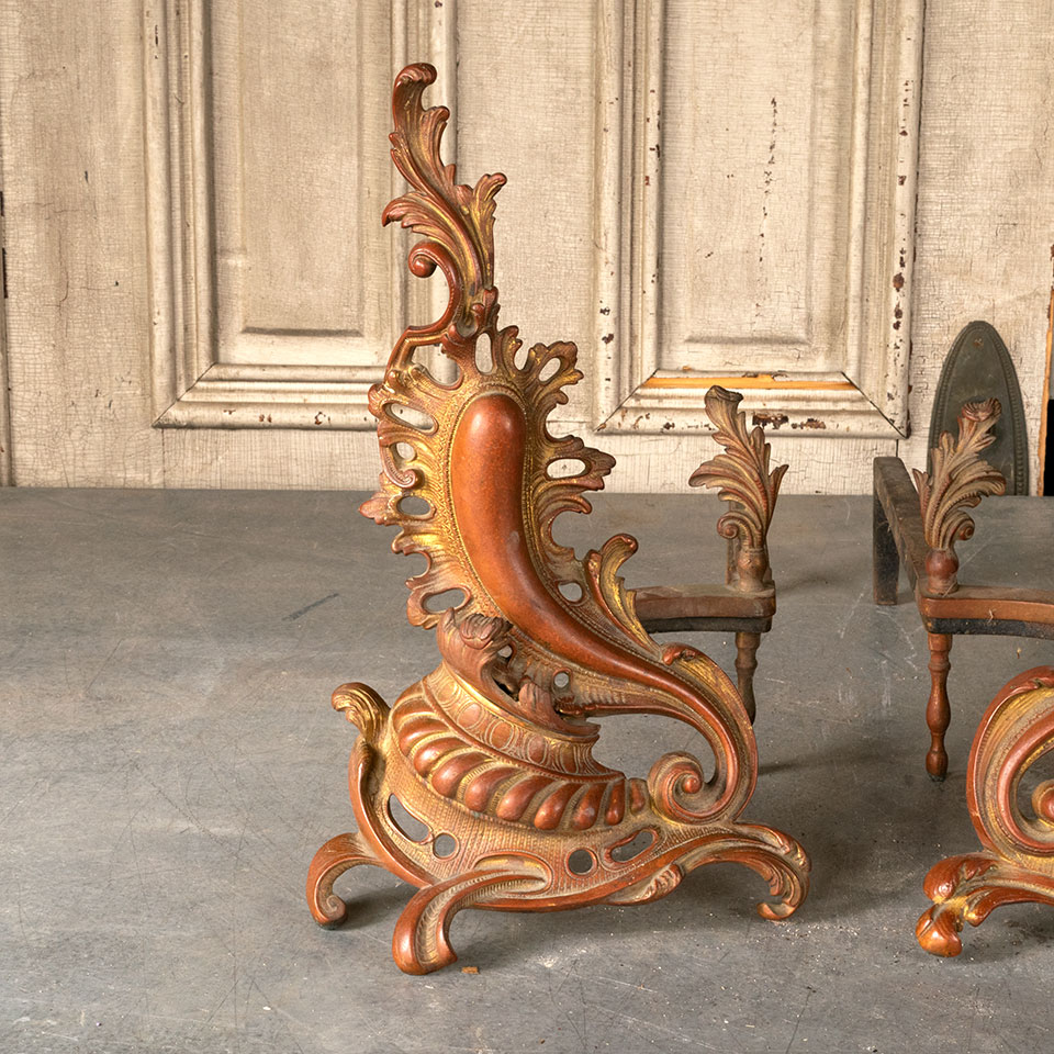 Pair of antique architectural salvage ornate French Rococo style brass fireplace andirons each measuring approx. 10” wide x 16” tall x 22” front to back. See photos to evaluate condition. Priced at $350 for the pair.