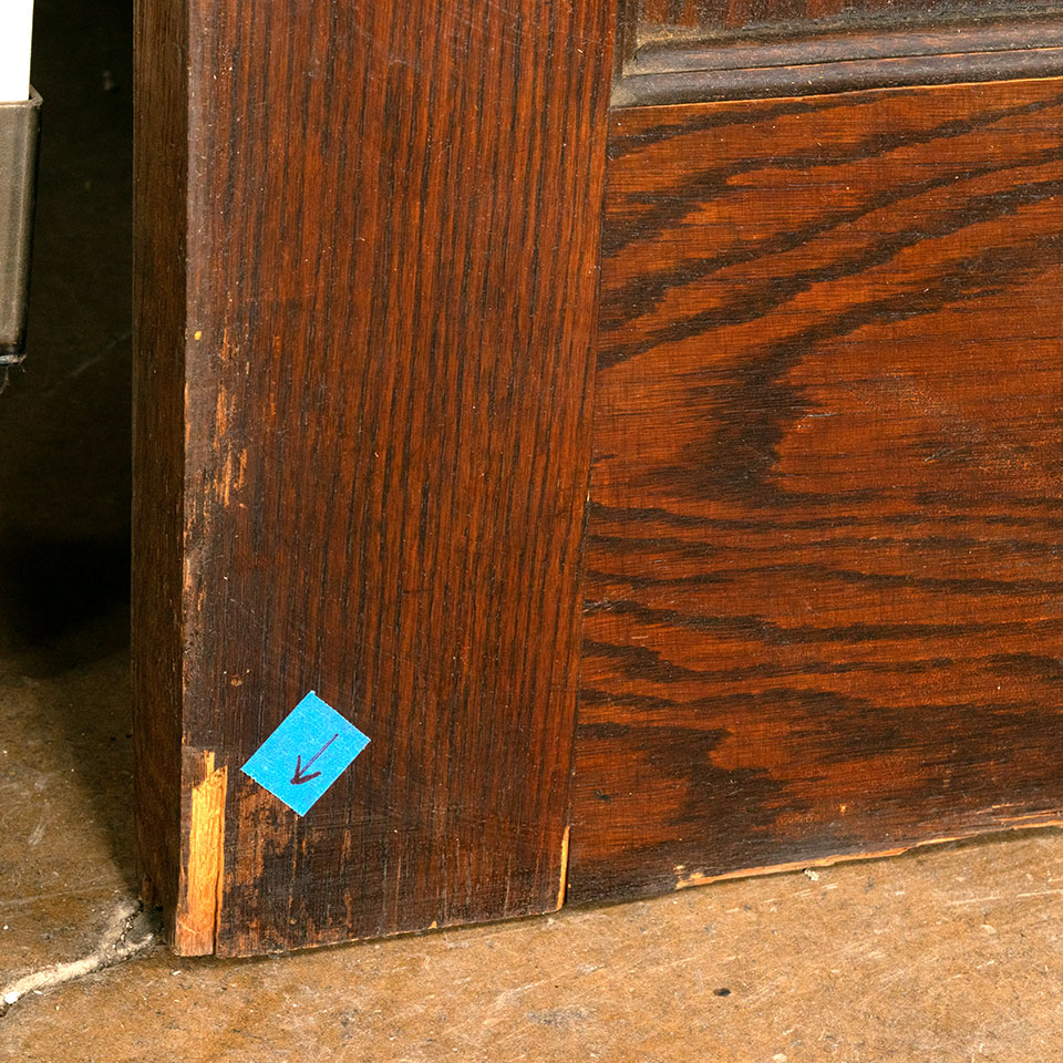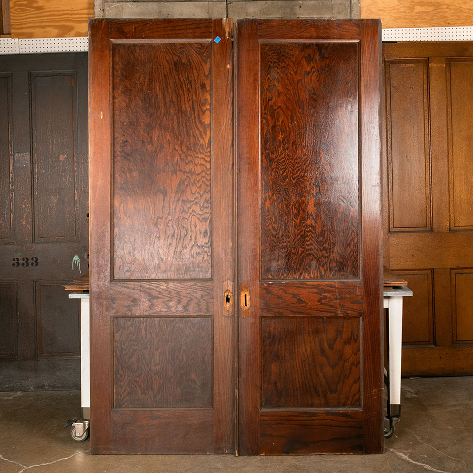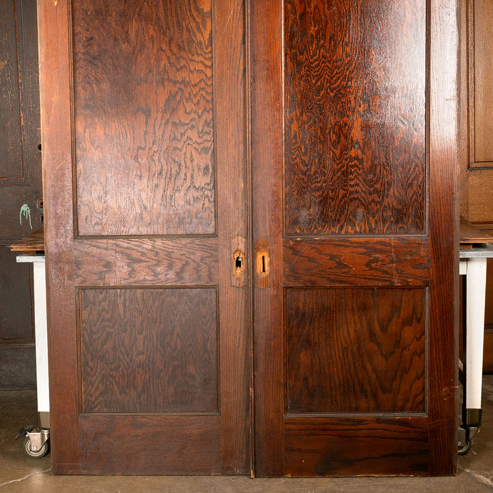 Pair of antique architectural salvage 2 panel oak pocket doors together measuring approx. 60 3/4" wide x 90 1/8" tall x 1 3/4" thick. There's veneer loss on both doors and one of the meeting rail trim pieces is missing. See photos to evaluate condition. Priced at $300 for the pair.