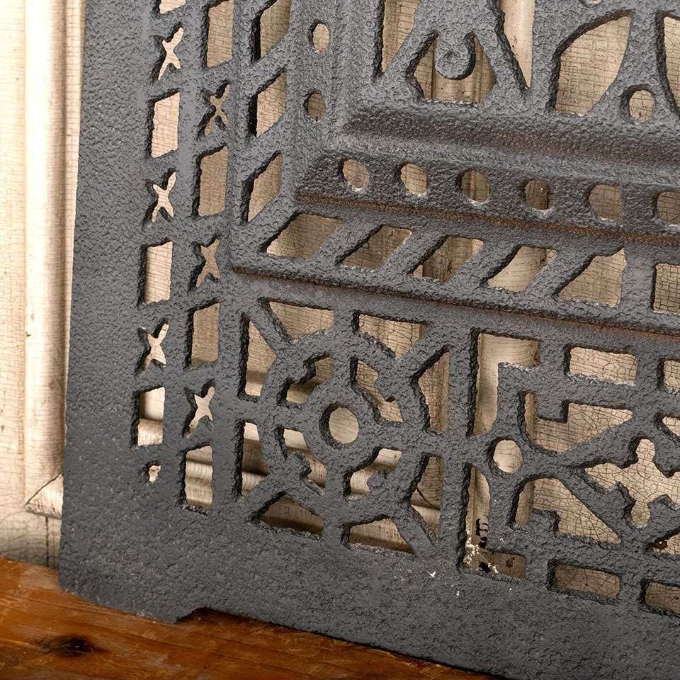 Antique architectural salvage cast iron fireplace summer front cover with floral motif measuring approx. 20" wide x 28 7/16" tall x 1 3/4" front to back. See photos to evaluate condition.