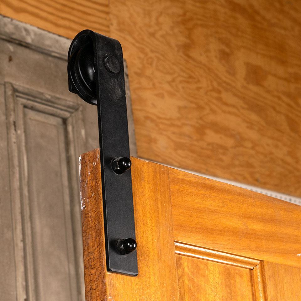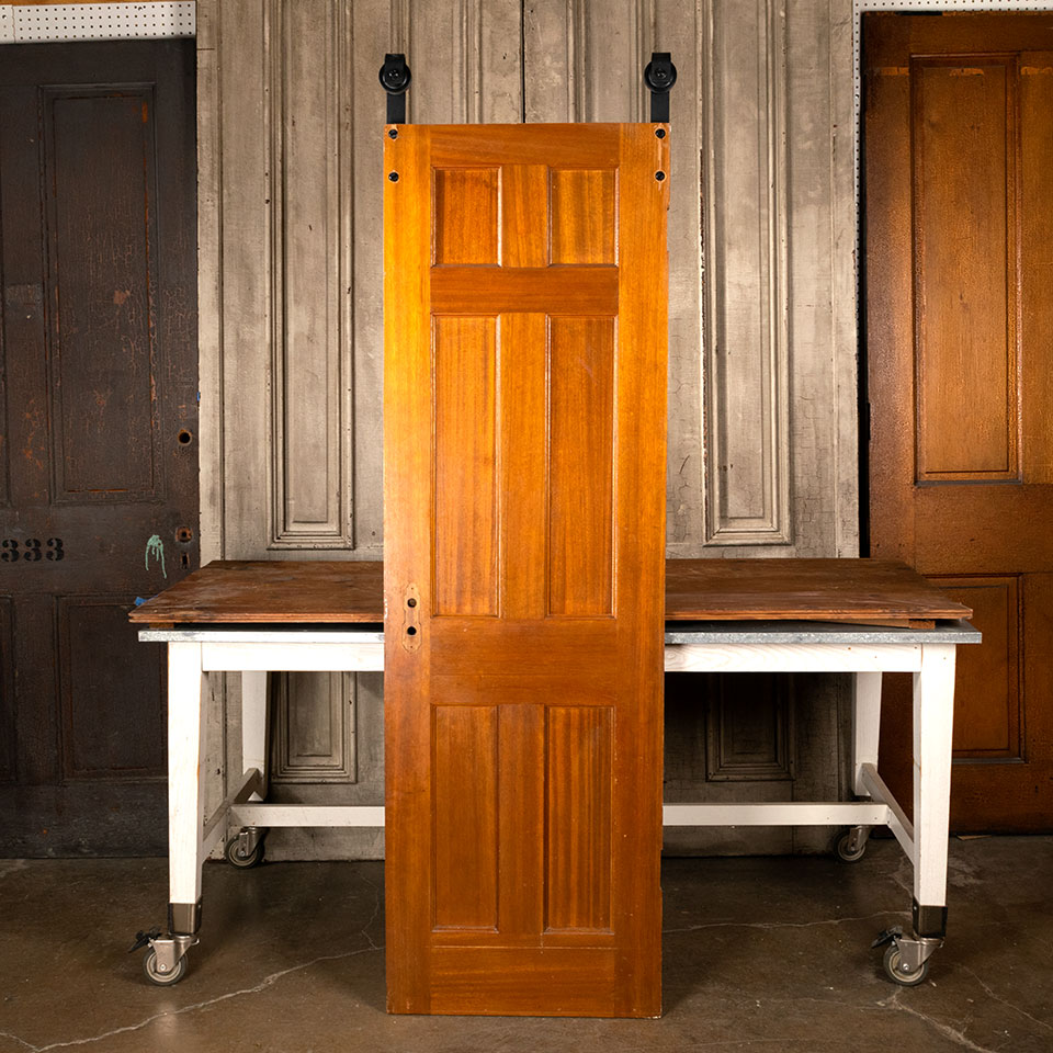 Vintage architectural salvage 6 panel mahogany wood interior door with modern barn door trollies measuring approx. 23 5/8" wide x 75 5/8" tall (81 1/2" to top of trollies) x 1 3/8" thick. There is no track with this door. See photos to evaluate condition.