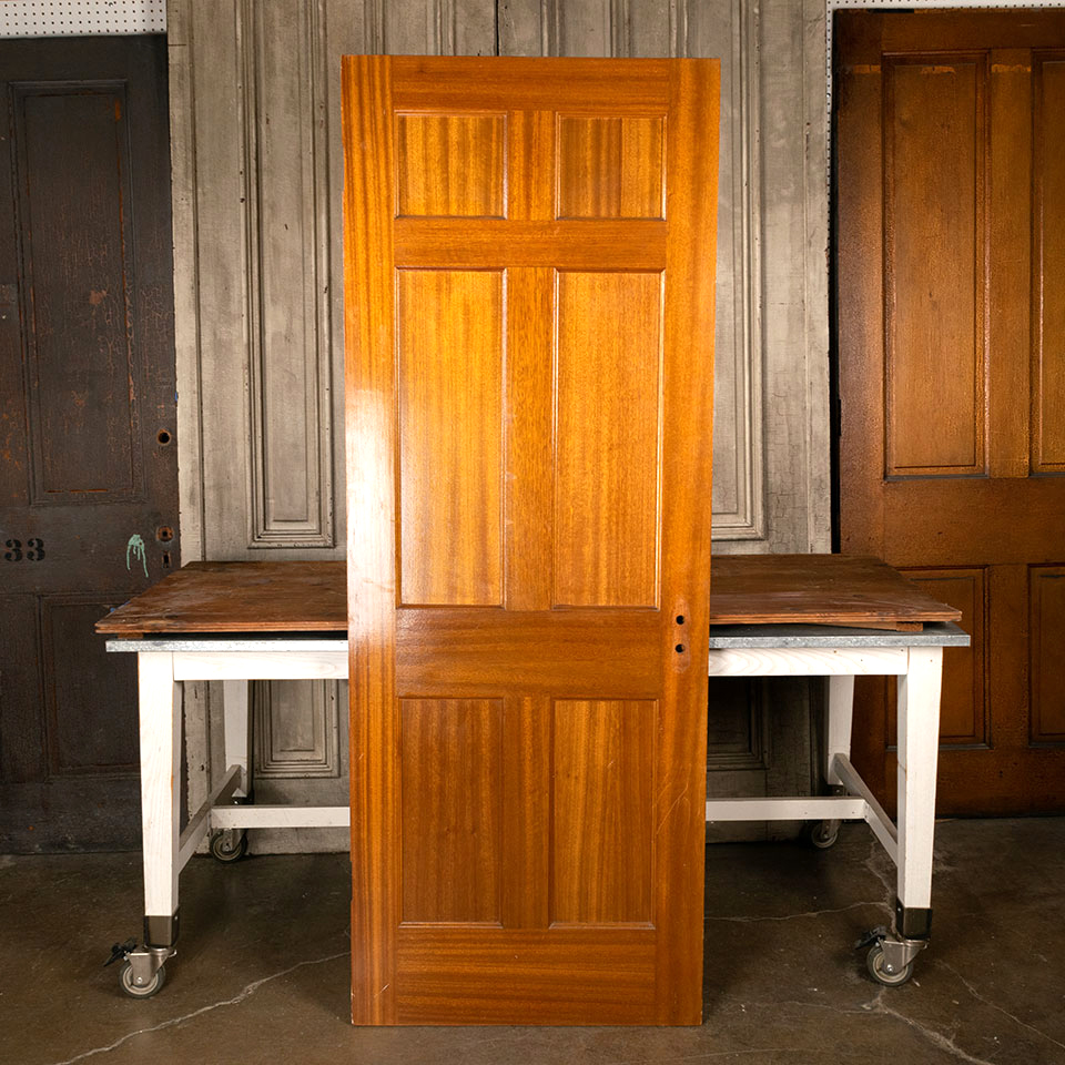 Vintage architectural salvage 6 panel mahogany wood interior door measuring approx. 29 3/4" wide x 79 1/2" tall x 1 3/8" thick. There are dents in the middle stile on one side of the door. See photos to evaluate condition.