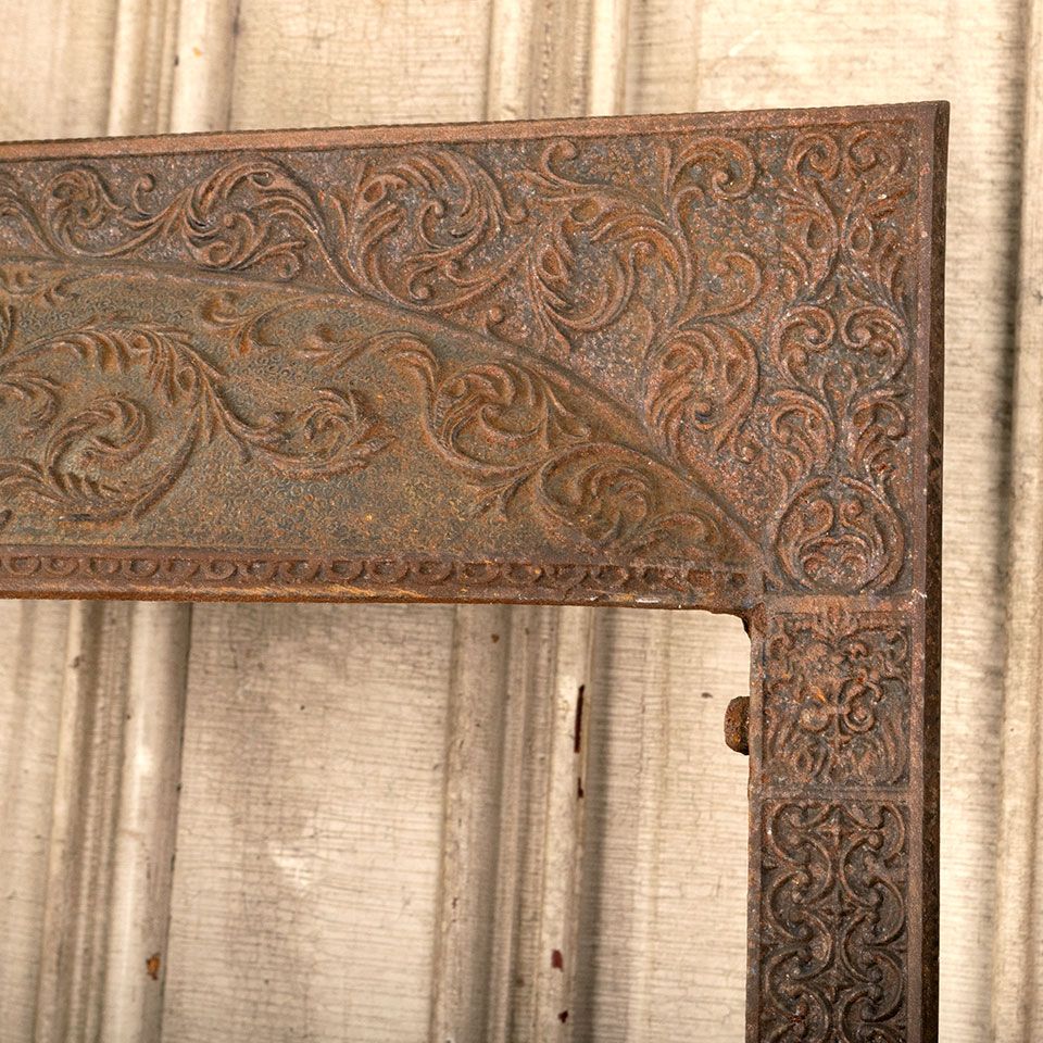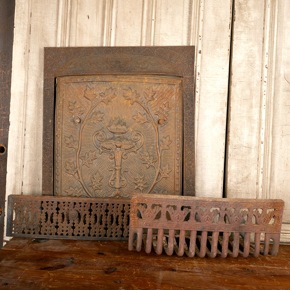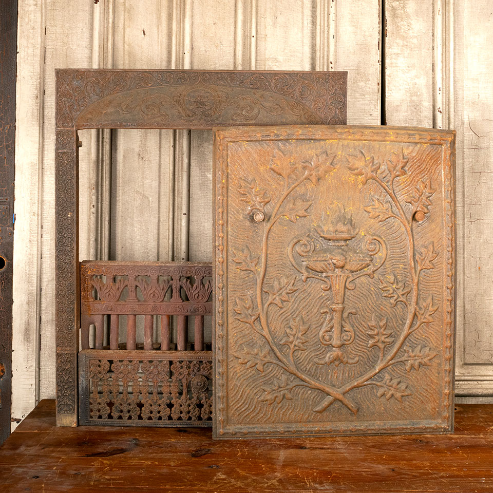 Antique architectural salvage 4 piece ornate fireplace surround, summer front cover, coal basket, and ember screen. The surround measures approx. 24 1/2" wide x 30 3/8" tall x 3 1/2" front to back with an interior opening measuring approx. 20 11/16" wide x 25 1/4" tall. The summer front cover is pressed metal, but the other pieces are cast iron. See photos to evaluate condition. Sold as a set. Priced at $725 for the set.