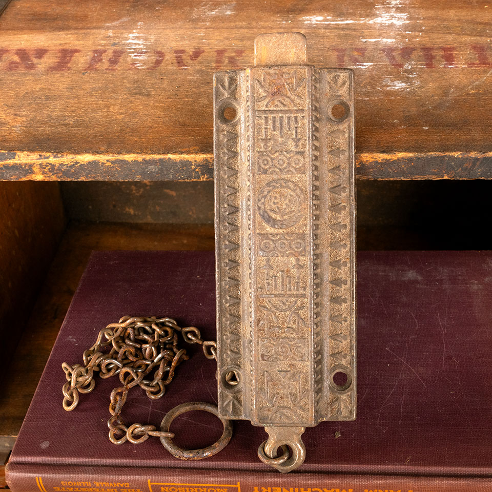 Antique architectural salvage ornate Victorian Eastlake cast iron surface mount door bolt lock with pull chain measuring approx. 2 3/16" wide x 5 5/16" tall x 3/4" front to back with a 23" long chain. There's no catch with this lock. See photos to evaluate condition.