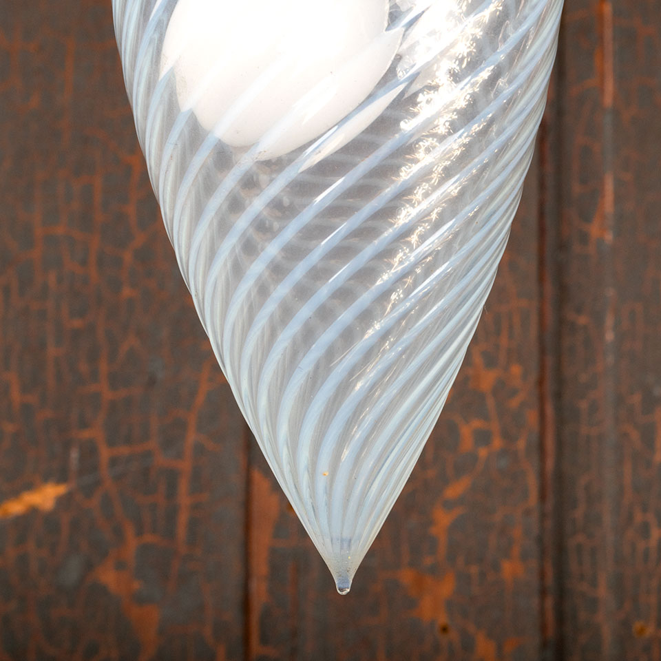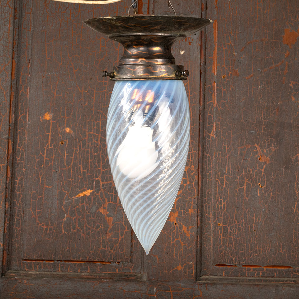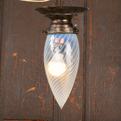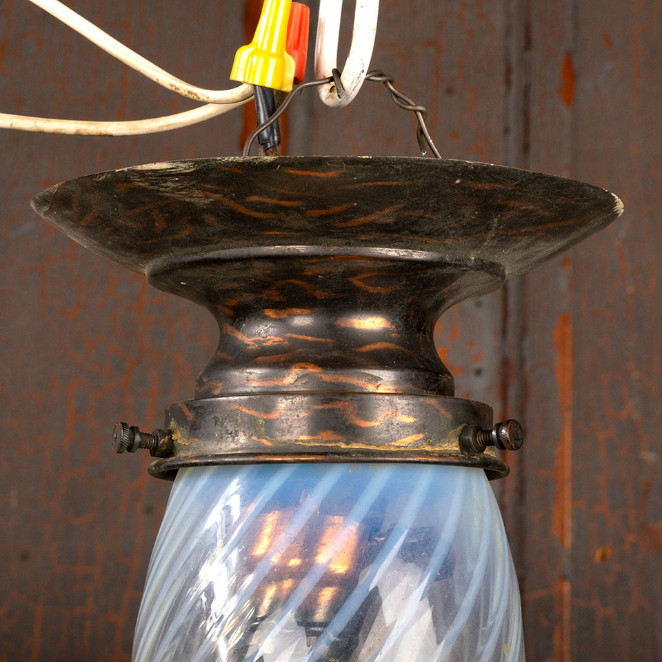 Antique architectural salvage flush mount ceiling single bulb light fixture with teardrop swirled glass globe measuring approx. 4' wide x 11 1/2" tall with a 6 1/8" diameter ceiling canopy. See photos to evaluate condition. A licensed electrician should inspect the fixture and wiring prior to installation.