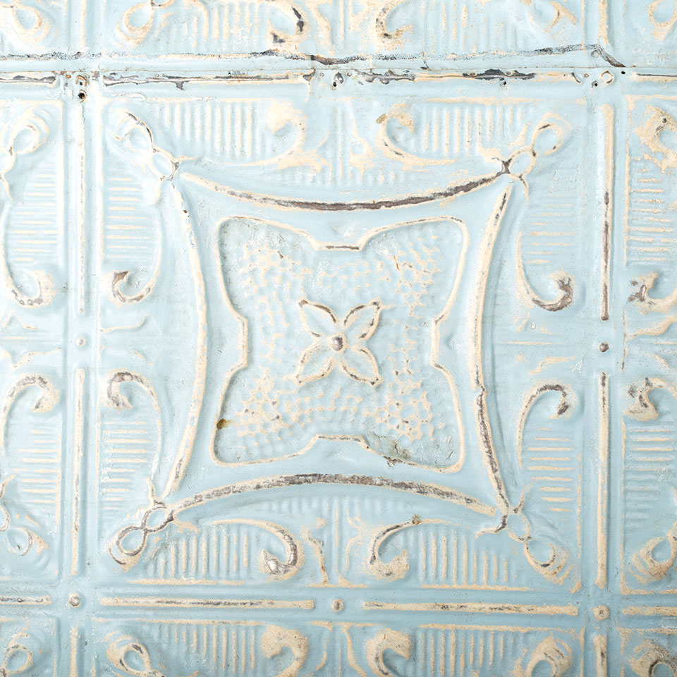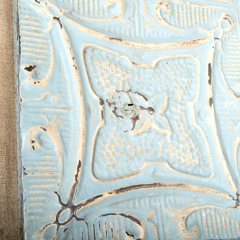 Wall hanging panel constructed of antique architectural salvage pressed tin ceiling tiles measuring approx. 46 3/4" x 46 3/4" x 1" thick. See photos to evaluate condition.